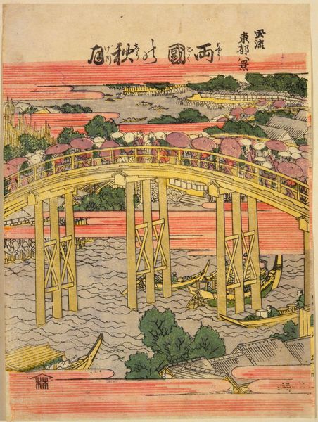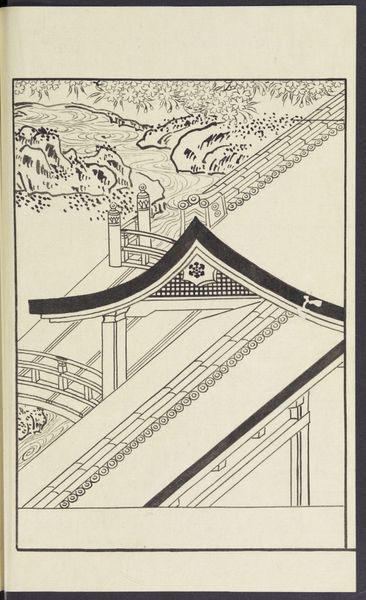 Editor: This is "Fuji with Seven Bridges in One View" by Hokusai, a woodblock print from his "One Hundred Views of Mount Fuji" series. The monochrome and intricate lines give it such a unique feel! What symbolic weight do you think the seven bridges carry in relation to Mount Fuji? Curator: The bridges act as visual metaphors, linking the mundane world of labor and travel to the sacred peak. Bridges often symbolize transitions, connecting different realms or stages of life. Consider how the travelers, dwarfed by Fuji, are on a pilgrimage, both literal and spiritual. Editor: That makes so much sense. I hadn't thought about the bridge as representing a spiritual journey. Curator: Yes, and note how Fuji remains constant, a silent witness to the transient human activities below. It’s a reminder of enduring values amidst fleeting moments. Editor: I'll definitely look at Hokusai's work with a new perspective now. Curator: And hopefully, you'll carry that perspective forward!