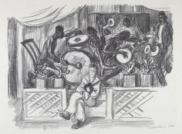 Editor: This is "Making Bread," an ink drawing from 1929 by Martiros Sarian. The scene feels very intimate, women gathered together sharing a repetitive task. There’s something about the uniformity of the shapes and figures that feels almost…oppressive. What do you see in this piece? Curator: The "oppression" you sense might stem from the representation of women within a domestic, almost timeless setting. Consider the historical context: 1929 was a time of immense social upheaval, even in Armenia. The work then becomes an interrogation of the roles assigned to women and their representation in art during this period. Does the uniformity suggest solidarity, or a lack of individual agency? Editor: That's interesting! I hadn't thought of it in terms of agency. The bread dough hanging on the wall – they look a bit like rows of identical figures themselves. It’s as if the environment mirrors the figures within it, reducing them to repeating forms. Curator: Precisely. Sarian seems to be playing with the relationship between labor, identity, and environment. Who benefits from this labor? Who is rendered invisible within the process? Consider the power dynamics at play: is this a celebration of tradition, or a critique of its constraints? Editor: It's making me think about the artist himself; what was his relationship to this scene? Was he an insider, representing his own community, or an outsider looking in? Curator: That’s a crucial question! Sarian was very engaged with his Armenian identity. Viewing his art as activism gives voice to ordinary citizens, drawing attention to how the women in his drawing are fundamental, not secondary, to the national cultural identity. Editor: Wow, I'm definitely seeing the artwork in a completely different light now! It's more than just women making bread; it’s about the social forces and historical tensions surrounding their labor and representation. Curator: Exactly! Art provides the space to interrogate not only representation, but how power functions within these settings.