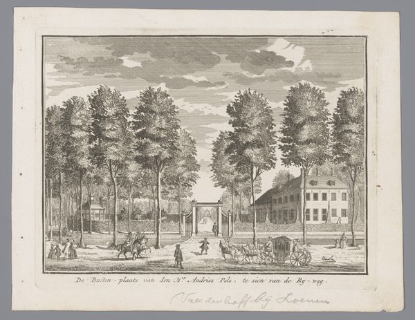 Daniël Stopendaal created this print titled "Gezicht op Loenen" sometime between 1682 and 1726, using etching on paper. Immediately, one is struck by the rigorous symmetry imposed on the natural world. The orderly rows of trees, the balanced composition, and the mirroring of elements all suggest a desire to control and organize the landscape. The linear perspective draws the eye toward the distant manor, emphasizing a hierarchical structure. It is as if Stopendaal uses line and form to mirror society's own rigid frameworks. But this isn't just about aesthetics; it's a statement. The artist invites us to consider how power is expressed through the manipulation of space, suggesting that even in depictions of nature, cultural values and social structures are always present. This print isn't just a picturesque view; it's a structured representation of authority and order, reflecting and reinforcing the cultural norms of its time.