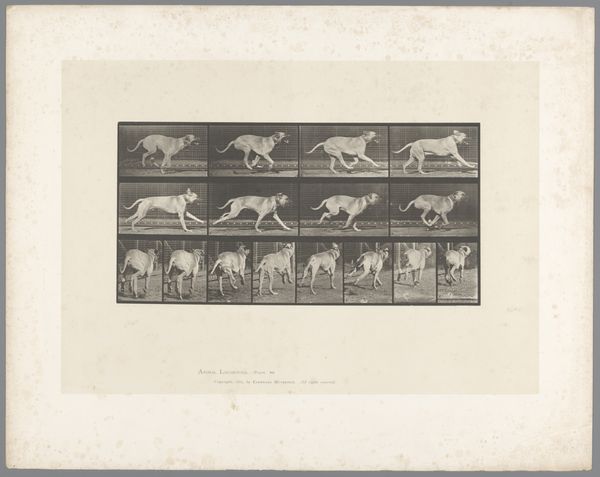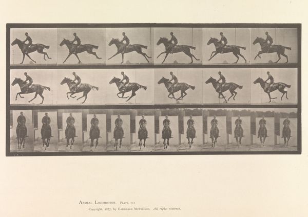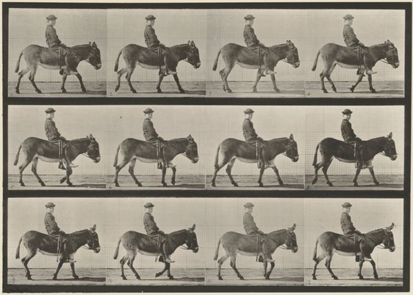 Curator: Let’s turn our attention to “'Bouquet', Galloping,” a gelatin-silver print by Eadweard Muybridge from 1887. What springs to mind when you first look at this series of images? Editor: It's like a burst of movement frozen in time! There’s a beautiful, almost balletic quality to the horse's gallop, and something undeniably melancholic to the grainy texture of each frame. Like little ghosts captured mid-stride. Curator: A fitting observation. Muybridge was, of course, interested in deconstructing movement itself. This piece is a prime example of his scientific approach, breaking down the horse’s gallop into sequential phases. The composition focuses intently on revealing the mechanics of locomotion through visual analysis, rather than romanticism. Editor: I get that, the intent's there, but I can’t shake the feeling that there’s something deeply poetic in his rigorous documentation. Imagine the horse doesn’t know it is helping settle a debate; it’s just… being. There’s an accidental dance in this "science." Curator: Interesting. From a formalist perspective, the tight cropping and stark contrast emphasize the horse's form. The rigid grid structure amplifies the concept, highlighting the differences in limb positioning, while grounding the horse in an analytical framework. Editor: It also hints at the future of cinema, doesn’t it? I mean, you can almost imagine this as a single looping GIF now. These individual shots show us the world a fraction of a second apart, reminding me about life in general—the smallest details reveal how ephemeral time is. Curator: Precisely. His experiments certainly influenced generations of artists and filmmakers, offering unprecedented insight into capturing reality through moving images, yet there’s this tension between the subjective and the objective representation of the physical realm. Editor: Yes. It's this dichotomy that makes the artwork truly sing. The horse is more than a mere "subject," because its spirit permeates those frames, turning mechanical breakdown into, well, beauty in motion. Curator: A perfect counterpoint to the pure structural composition. Editor: Precisely. That tension. Delicious, isn’t it?