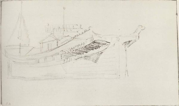 Editor: This is "Boat and a Kneeling Man near a Bucket," a pencil drawing on paper by Johan Hendrik Weissenbruch, sometime between 1834 and 1903. It’s a simple sketch, very spare, almost… melancholic. What do you see in this piece, beyond just a boat and a man? Curator: It is indeed spare, almost iconic in its simplicity. The boat, for me, evokes a sense of journey, of passage. But the kneeling man, almost indistinct, adds a layer of somber reflection. Water is life, isn't it? And yet, the labor involved in simply drawing water from it... what stories might it hold? Think about the countless generations whose lives were intertwined with such boats and labor. What memories does this imagery awaken in you? Editor: I guess I see a connection to work, the everyday grind. He's kneeling, which has religious connotations, but he's just getting water. So is it sacred or just… necessary? Curator: Exactly! It’s that tension that makes it so compelling. The act of kneeling itself is a powerful symbol, signifying reverence, submission, or even desperation. Is the artist commenting on the dignity of labor, or perhaps the burdens it places on us? The boat, too, becomes symbolic - freedom or confinement? Notice how Weissenbruch doesn't give us clear answers; he leaves it open to interpretation. The boat, the man, the bucket - each carrying an emotional weight accumulated over centuries of human experience. Editor: It's interesting how a simple sketch can hold so much, once you start unpacking the symbolism. Curator: Precisely. It’s in these quiet, unassuming images that we often find the most potent echoes of our collective past. What have you learned about reading an image after looking closely here? Editor: I’ve learned that even seemingly simple drawings are full of symbolism waiting to be uncovered! Thanks!