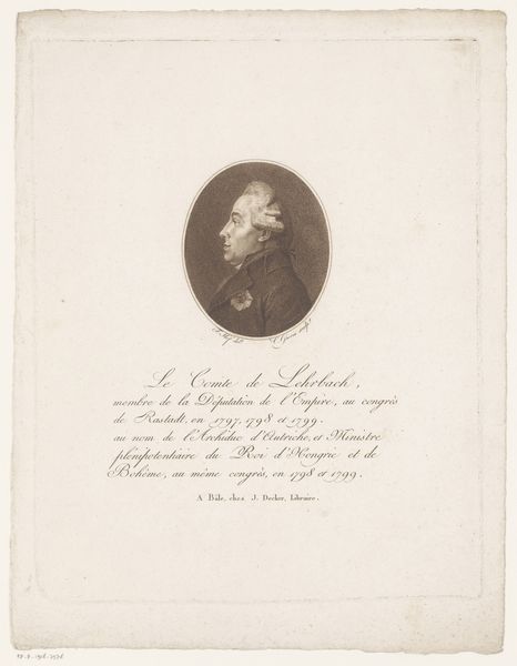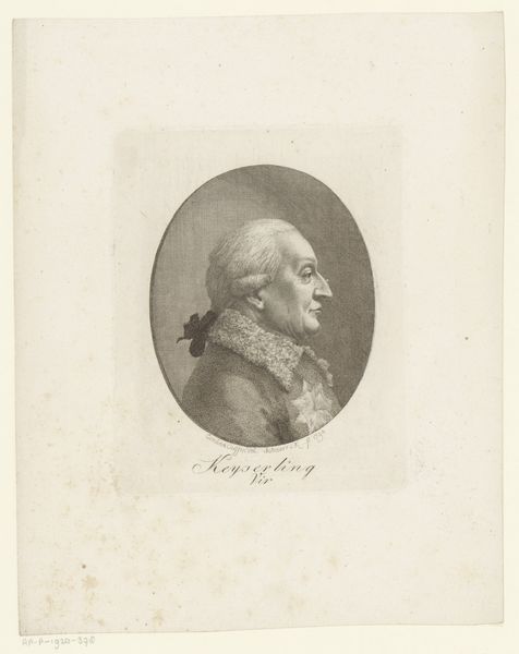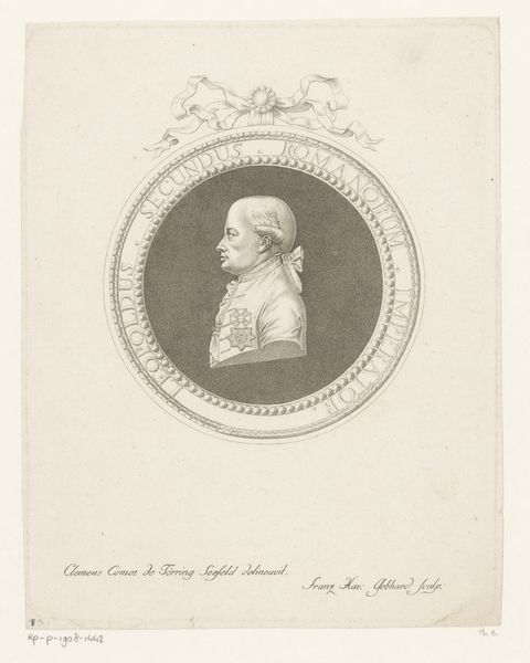 Curator: Take a look at "Zelfportret van Christoph Wilhelm Bock op 22-jarige leeftijd," or "Self-Portrait of Christoph Wilhelm Bock at the Age of 22," created in 1777. It’s an engraving by Christoph Wilhelm Bock himself, now held at the Rijksmuseum. Editor: My first impression is of cool detachment. The stark black lines on the pale paper create a feeling of austerity. The limited tonal range gives it an almost academic feel, despite being a self-portrait. Curator: That's an interesting take. Self-portraits, especially during this period, often carried symbolic weight. Neoclassicism looked to antiquity, so the profile view harkens back to ancient Roman portraiture. Bock is positioning himself within a historical and intellectual lineage. Editor: Precisely, look at the circular frame! It’s almost as if he's on a coin, elevating his image to near-heroic status. The engraver uses hatching techniques to model form, creating texture and dimension that is visually stunning. Curator: And that powdered wig, though fashionable, served to symbolize status and intellectual belonging. He presents himself as a man of reason and learning, very much aligned with the values of the Enlightenment. One can think of the psychological weight the image gives itself. Editor: The fine details certainly reveal mastery of technique. But beyond the symbolism, what about its effect? The severe angles and monochrome palette make it feel rather distant. Curator: I think that perceived distance is part of the message. He isn't baring his soul but presenting a carefully constructed image. His image is part of this broader context. Editor: So it's a strategic performance rather than introspection? In that case, the art effectively captures the ethos of its time. The medium is crucial for its creation and historical preservation. Curator: Precisely, it is the strategic image for historical performance. And it does raise questions about how we construct identity through art and visual symbols. It can serve as a document in various narratives and history painting themes. Editor: It gives pause to reconsider art as more than personal expression but the complex intersection of social and historical currents. The self and persona—delicate balance! Curator: Absolutely. The visual symbols that have permeated cultures allow for this piece to maintain its historical importance as we still evaluate Bock's constructed identity in this portrait today.