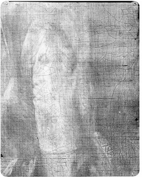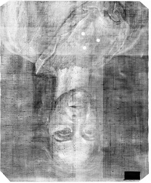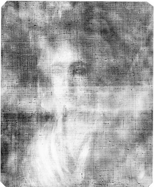 Curator: Here we have an X-radiograph of "Madonna and Child," believed to be in the style of Giovanni Bellini. It offers a fascinating glimpse beneath the surface of a familiar subject. Editor: It’s ghostly, almost unsettling. You see the weave of the canvas so clearly – it makes me think about the hand that prepared it, the labor. Curator: Absolutely. X-radiography unveils the evolution of the composition, revealing the artist's process of layering and adjustment, and, in turn, the social and cultural expectations around the Madonna and Child imagery. Did the artist face any backlash in portraying motherhood in this way? Editor: And what about the pigments? How were they sourced, ground, and applied? The materiality dictates so much of the final image and the cost of production surely influenced the audience. Curator: Indeed. The image prompts us to question the conventional narratives surrounding the artwork, to look beneath the surface, both literally and figuratively. Editor: It's amazing what you can learn about an artwork when you examine what it's made of.
