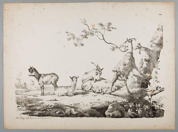 Curator: Ah, yes, Jean Louis de Marne's "Four Goats." I’m particularly drawn to how de Marne captured these pastoral scenes, full of quiet moments. Editor: It gives a feeling of…bleakness, almost? A severe etching of goats. It's quite arresting. Curator: Arresting, yes! The artist’s skill is so apparent. There’s something almost haunting in the details of the goats’ faces, which I see as reflections of the pre-Revolutionary aristocracy. Editor: I see the goats' placid existence as a critique of power structures—or perhaps the naivete of rural life juxtaposed against the impending social upheaval of the time. Curator: That's a brilliant observation. Editor: These goats are such interesting signifiers! Thanks for expanding how I view this piece. Curator: It’s been such a pleasure discussing it with you!