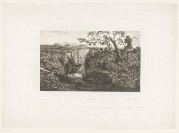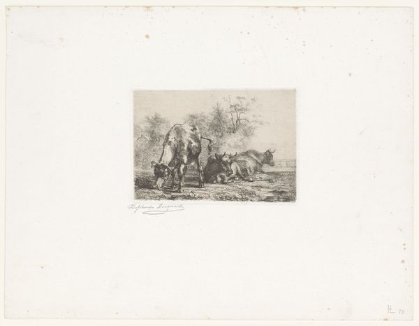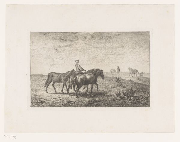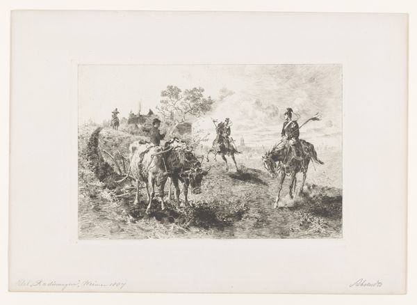 Conrad Ahrendts created this landscape featuring a fisherman and a farmer's wife, using etching techniques to achieve its delicate lines and textures. The composition, dominated by horizontal lines, guides our eyes across the scene, evoking a sense of serene rural life. Ahrendts's use of line and form is particularly striking. The figures are rendered with subtle detail, their forms defined by careful etching that captures the texture of their clothing and the weight of the buckets they carry. Note how the diagonal line of the fisherman’s pole breaks the horizontal emphasis, adding dynamism to the composition. The sky, with its soft clouds, is rendered with lighter, more diffused lines, contrasting with the more defined foreground. The interplay between light and shadow is carefully managed to create depth and volume, yet there is a consistent focus on the material qualities of the etched line itself. It is in this careful attention to form that the piece finds its expression, inviting us to consider the underlying structures that shape our perception of the world.