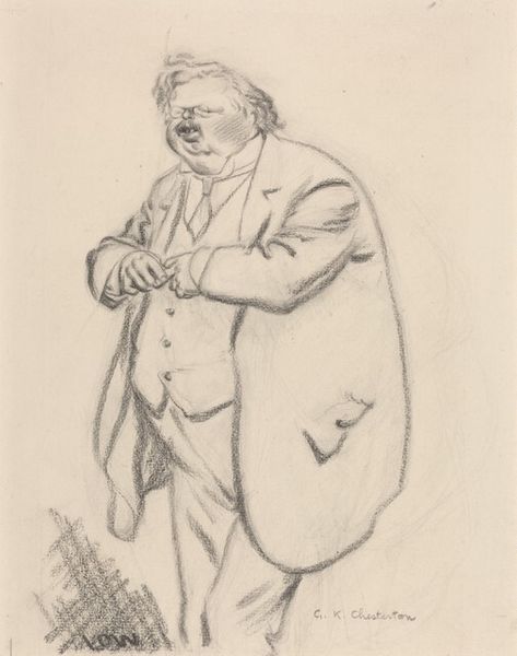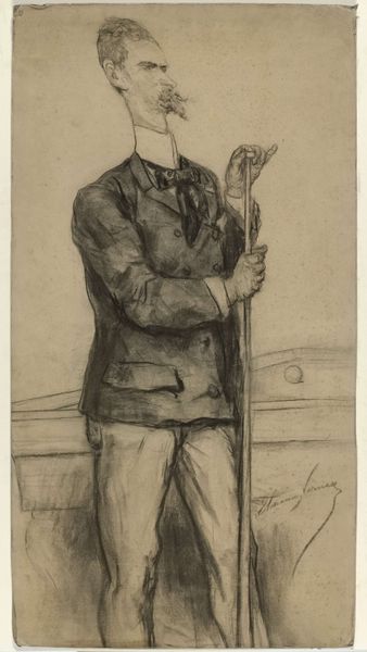 Curator: I’m immediately struck by the vulnerability conveyed in this posture; there's a searching quality, almost self-conscious. Editor: Indeed. We're looking at a drawing by Elchanon Verveer, likely executed between 1860 and 1899, held at the Rijksmuseum. Its title is "Caricature Portrait of Antonie Cornelis Loffelt (1841-1906), viewing an exhibition of drawings.” Curator: The fact it's a caricature and yet possesses this sense of introspection is fascinating. His pose-- slightly stooped, head bowed, spectacles in hand--speaks volumes about the act of looking and judging. What symbolic weight might those other drawings on the wall carry? Are they meant to reflect his own aspirations, perhaps his artistic failures or anxieties? Editor: From a formal perspective, notice the economy of line. Verveer manages to convey a sense of volume and texture using only pencil strokes, a remarkable feat of draftsmanship. The limited tonal range creates a subtle, almost ethereal quality. Curator: And that hat he's carrying almost feels like an object held close, an attribute of belonging to a certain society or profession at the time. It almost suggests a separation between the individual and the art world. He seems on the outside even while present at this art show. Editor: I agree. Also note the way Verveer suggests space; we infer the room through subtle changes in line weight. It's an elegant solution, minimalist yet effective. Curator: The portrait operates almost like a mirror. The artist isn't simply representing Loffelt. There is an implicit connection inviting the viewer to contemplate their own gaze. Editor: The soft grey palette underscores the quiet observation. It's a moment of private contemplation rendered public. I found the artist’s use of tonal variation particularly evocative. It guides the eye effortlessly through the composition, doesn't it? Curator: I concur completely; this drawing offers so many layers to contemplate. Thanks for helping me think about this from a formal point of view. Editor: My pleasure. I'm taking away from this, is the delicate touch that enhances the reflective nature of the portrait.