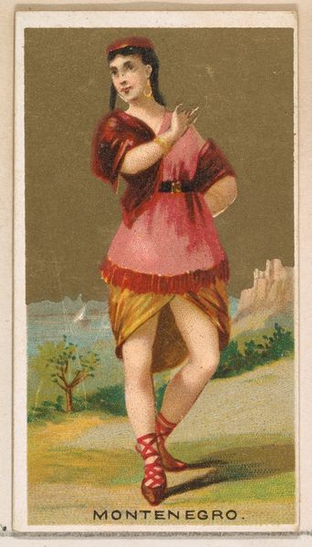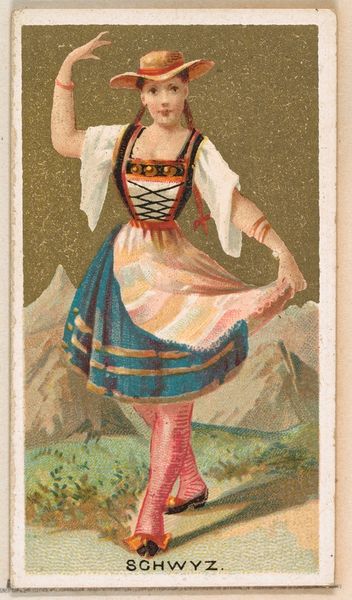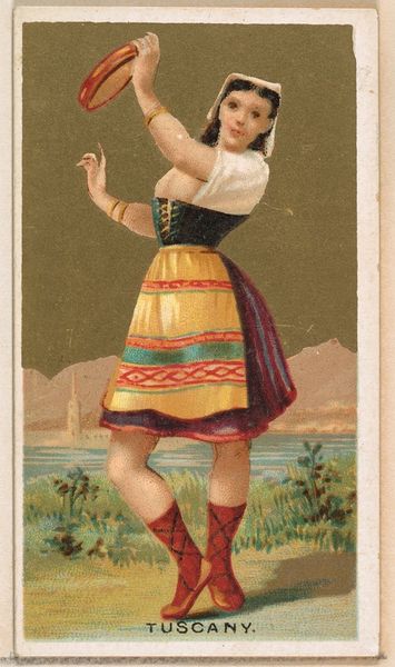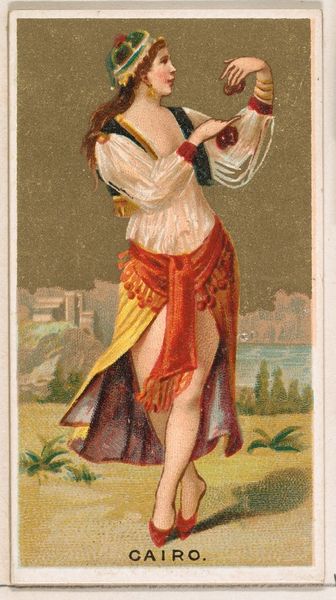 This small chromolithograph, "Peru," from the "Dancing Girls of the World" series by Wm. S. Kimball & Co., presents a vibrant figure against a stylized landscape. The dancer's dynamic pose, with its playful angles and curves, immediately catches the eye, evoking a sense of lively movement. The composition balances the dancer's figure with the backdrop, creating a layered effect. The warm tones of her clothing and skin contrast with the cooler greens and blues of the landscape, drawing the viewer's gaze across the image. This use of contrasting colors serves to highlight the dancer as the central figure, while the background provides a context that flattens the depth of the image. Here, the artist uses the visual language of color and form to construct a representation of Peruvian identity. The image isn't just a depiction, but an interpretation. The tension between exoticism and representation reflects broader cultural discourses of the time, inviting us to consider how these images shape our perceptions. Each viewing offers a chance to reassess these meanings, recognizing the ever-shifting nature of cultural interpretation.