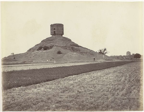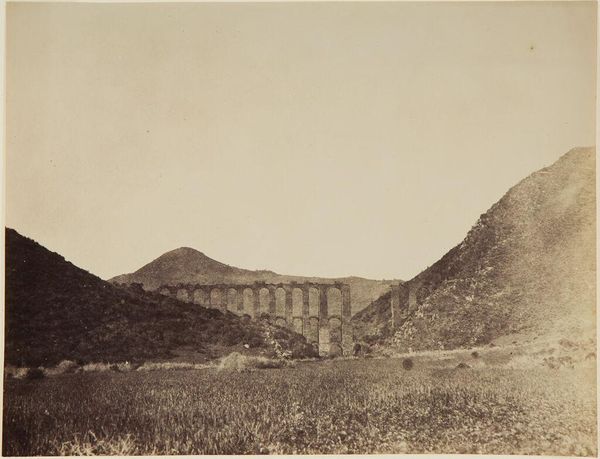 Curator: The sepia tones evoke a sense of looking back in time. What is it that we're seeing exactly? Editor: We’re looking at a landscape, most probably dating to between 1857 and 1858. The photograph is titled "Namculdroog: Droog and Tank," and it’s an albumen print by Linnaeus Tripe. The scale seems quite vast, but subdued at the same time. The horizon is a bit oppressive, making me think of resource extraction, or enforced labor. Curator: It's fascinating how you connect the materiality to those broader themes. As you probably know, Tripe was commissioned by the British East India Company. So, you are not wrong in seeing an oppressive horizon—the photographic process itself was very labor intensive and tied to the colonial project and orientalist imagery, wasn't it? Think about the chemistry, the development process, and the sheer physical labor to get to the finished print! Editor: Precisely! And the orientalist framing here is inescapable. This photograph becomes a tool of documentation, cataloging a landscape ripe for colonial exploitation. It is rendered both monumental and strangely inert under his lens. Curator: It's not just the act of photographing but also the presentation. This was, most likely, part of an album. So think of the collecting, the organizing, and the display of these images for a specific audience back in Britain. What was their intended purpose? Editor: To showcase the "exotic" landscape, to assert dominion and control, and also to stimulate British consumption. But, I wonder, what were the local populations doing as Tripe documented their land? What resistances might have occurred? We never hear these accounts. Curator: A crucial point. The silences and the missing narratives are just as significant as what is presented in the photograph. By viewing Tripe’s image critically, acknowledging its historical and social context, we can start to dismantle those ingrained colonial perspectives and ask, as you have so eloquently done, who is missing from the frame and why? Editor: By really delving into the material and the circumstances of its production, we've given an afterlife to these otherwise static views. Curator: Absolutely, and by analyzing the image in light of postcolonial and materialist readings, perhaps we can give a voice back to that which has been silenced by imperial processes.