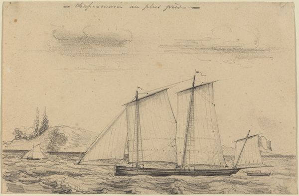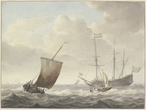Dominic Serres created this work, Sailboat at Sea, using pen and brown ink with gray wash on laid paper. The use of pen, ink, and wash lends itself to the creation of tonal variations. Notice how Serres masterfully uses these to depict the rough sea, suggesting the weight and texture of the water. The drawing technique, with its emphasis on line and shading, captures the essence of maritime life. Dominic Serres' artistic practice was rooted in a deep understanding of the sea. He combined technical skill with an intimate knowledge of shipbuilding and sailing, honed by direct experience as a sailor. Consider the level of skill required to accurately represent a sailboat in motion. Serres’ artwork reflects his understanding of maritime culture and the labor involved in seafaring. It challenges our perception of ‘high art’, inviting us to appreciate the skill, knowledge, and lived experiences embedded in this seemingly simple drawing.