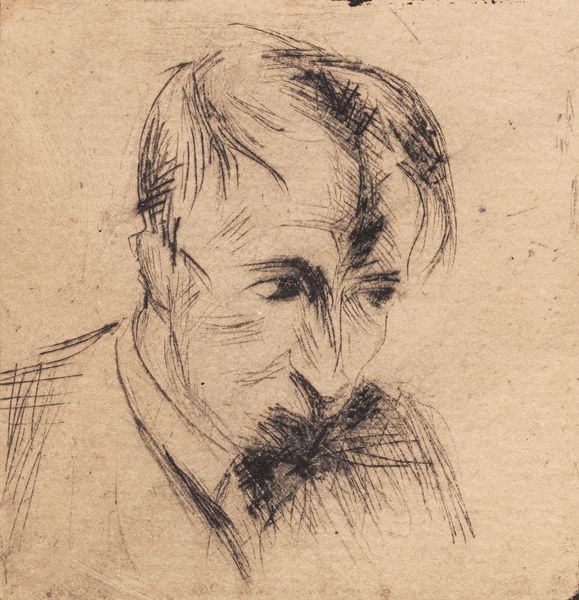 Curator: Let's delve into this striking drawing, "Portret van Richard Roland Holst," crafted by Jan Veth between 1874 and 1925. Editor: Immediately, I'm drawn to the intense contrast created by the graphite on paper. It feels almost sculptural, like he's been carved out of the darkness. Curator: Veth, a prominent figure in Dutch intellectual circles, created this portrait during a period where realism was becoming more psychological. Portraits weren't just about likeness, but capturing the sitter’s inner world, especially those prominent in the arts and social reform. Editor: You can see the intensity in Holst's gaze. I'm curious about the choice of graphite – it allows for this incredible range of tones and textures, from almost wispy suggestions to bold, definite lines that make his features stand out. What was the impact of access to specific types of graphite or paper? Did its cost or quality affect artistic creation at the time? Curator: Good questions! The availability of quality materials certainly played a role. Fine graphite allowed for detailed work that catered to the rising middle class who sought portraits as markers of status and refinement. Roland Holst himself, deeply involved in socialist ideals, was not from that social background, as Veth represents it here. Editor: And there’s an undeniable softness to the paper’s edge—its imperfections remind us that this is a material object, worked by an artisan and subjected to a certain context. How were portrait drawings like this consumed at the time? Curator: Portrait drawings were often commissioned by family or friends. They circulated among a specific social circle. Some, especially those of prominent figures like Holst, found their way into public collections. That’s how we see art history taking a hold of political significance in art reception, creating enduring social echoes. Editor: It brings a deeper connection to the hand of the artist, the choice of materials, and the ways that process shapes our viewing experience even today. Curator: Precisely. It underscores that our interpretation of an artwork evolves through shifting social currents. Editor: Reflecting on this, I see the drawing not only as a rendering of Holst, but also as a statement of identity—shaped by material conditions and circulated within layers of socio-cultural influence. Curator: Agreed. Veth’s portrait offers a tangible glimpse into the artistic, social, and political landscapes of its time.