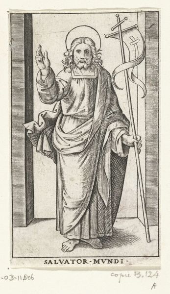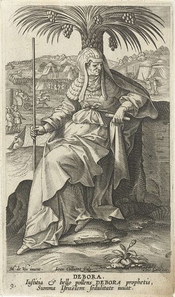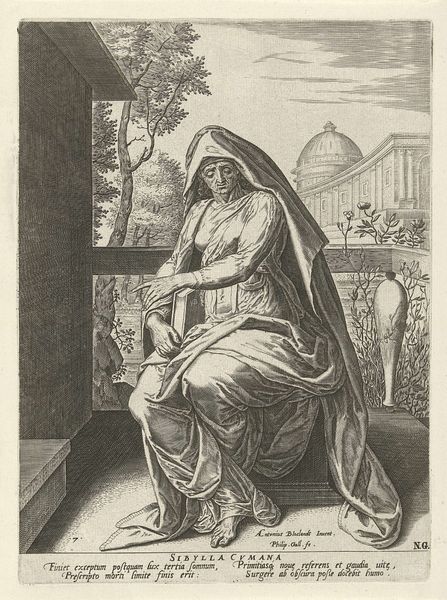 Curator: What strikes me immediately about this piece is the incredible detail achieved through the engraving technique. The way the light plays across the fabric of Hanna’s garments is masterful. Editor: Indeed. We're looking at "Hanna de profetes", created between 1595 and 1599 by Karel van Mallery. This engraving is part of the Rijksmuseum's collection, and I'm captivated by its placement of a biblical figure in the context of the late 16th century and its impact on the perception of religious devotion. Curator: Notice how the burin work defines the textural contrasts - the smoothness of the architectural backdrop, especially compared to Hanna’s ruffled collar, draws my eye right in. The labor involved in this process speaks volumes. It's all about meticulous repetition, line after line. Editor: Absolutely, the context is also shaped by how the artist and printer, likely part of a workshop, contributed to spreading these religious images for personal contemplation. Furthermore, what can we read into Hanna as the emblem of the modest yet powerful prophetess for a specific demographic during the rise of the printing press? Curator: And those textures help build a realistic character. A moment of personal reflection. Looking closer at those fine lines again – seeing the aging process expressed so intricately reminds us of the accessibility of prints at the time. We need to consider both the artistry, labor, and wider consumption practices. Editor: The institution obviously plays a central role. It shapes what’s being valorized through its curation. How did an image like this circulate and shape early modern understandings of devotion or femininity? Was it connected to religious reformations of the era? And what choices have we made to bring this particular piece, among so many, into public view today? Curator: All excellent questions. Ultimately, this artwork allows us to see devotion through both the labor and dissemination of image-making at the turn of the 17th century. Editor: Yes, examining its journey – from conception to its current position on the museum wall – is crucial to appreciate both its artistic merit and historical meaning.