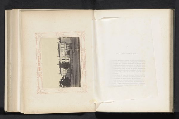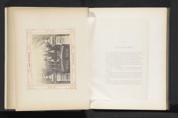 Curator: Oh, I find this so enchanting! We're looking at an albumen print titled "Gezicht op Château Malescot St. Exupéry in Margaux, Frankrijk," believed to be created before 1867 by Alfred Danflou. What strikes you most immediately? Editor: The somber tone jumps out. It feels like a scene shrouded in history, that the photo captures an enduring moment that we're now a fly on the wall for. Almost like peeking through time's keyhole. Curator: Precisely! Danflou seems to capture that timelessness using plein-air photography, emphasizing the real, breathing world around the Château. The softness of the print and the romanticism gives it that wistful feeling, doesn't it? Editor: Absolutely. And that ornamental border! It frames the subject matter, as the trees do in the photograph itself, underscoring its inherent visual structure and inherent symmetry. Curator: Right! By using that framed presentation and this medium of albumen print, it gives it this elevated and almost precious quality. Which seems interesting as a contrast to the reality of this place and people that inhabit it. Editor: It’s a deliberate construction, manipulating reality to serve an aesthetic ideal. This pre-photographic manipulation becomes a significant commentary on how photography was perceived as the art world evolved through that moment. Curator: Yes! A blend of romanticism and academic ideals attempting to meet within a single work. And in a way it feels so beautifully melancholy now looking back through a different lens! Editor: Indeed, the work encourages one to pause, reflect on the transient nature of visual art through photographic artmaking in landscape, and its lasting effect that speaks still today. Curator: That really makes one wonder, how Danflou might react knowing we are still talking about it today! Thank you for diving in!