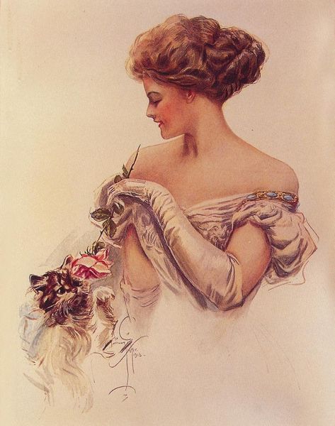 This Saturday Evening Post cover from May 1902, by Harrison Fisher, looks to me like it was made with layers of delicate watercolor washes. The way the colors blend and fade, suggests a real understanding of how to build up an image, slowly. There's a lightness to the whole thing, not just in the palette, but in the way the paint seems to float on the surface. Look at the petals scattered around her dress; they’re a frenzy of pink and violet, with soft edges. And the dress itself? It’s like he’s barely touched the paper, letting the color create the form, rather than defining it with hard lines. It is also very beautiful, even if a bit saccharine for today's tastes. Fisher's work reminds me of John Singer Sargent, especially in the way he captures the fleeting quality of light and beauty. But Fisher’s got his own spin, a kind of romantic sweetness that's hard to resist, even if you try. Ultimately, it’s a reminder that art can be both beautiful and a little bit silly, all at the same time.