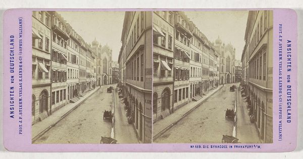 Editor: So, we're looking at Charles E. Goodman's "Straat in Orta San Giulio, Italië," taken sometime between 1857 and 1863. It's a photograph, obviously, and it strikes me as incredibly still. The buildings seem to hold a secret, quiet story. What jumps out at you when you look at this, Professor? Curator: Ah, stillness. I feel it too. And secrets. You know, the camera, in those days, held its own kind of magic. The way it captured the light… It wasn't just recording; it was almost a form of alchemy. And what emerges? An Italian street, silent, waiting. Do you sense any whispers of the Italian Renaissance peeking through those facades, in the geometric composition? Editor: I hadn’t thought about that specifically. I guess the building designs do have that order and harmony that you see in Renaissance art. Why photography, though? What drew Goodman to capture Orta San Giulio this way? Curator: That's the million-dollar question, isn’t it? Was it simply documentation? Or something more? I suspect he saw a timelessness there. He wasn't just capturing buildings; he was trying to preserve a moment, a feeling. Think about those merchants' stalls – the awnings offer fleeting moments of shade. Imagine standing there yourself… Does it bring you closer to that time? Editor: It's like a portal, I guess. It makes you wonder what they were selling at those stalls. And yes, imagining the people there brings it to life, in a way the still image alone wouldn’t. Curator: Exactly! Photography can unlock history. Maybe that's Goodman's great achievement – that subtle power to transport us. Now, do you feel differently about the "stillness?" Is it an emptiness or a fullness? Editor: I think it's definitely more of a fullness now. It's not just an empty street; it's a street teeming with untold stories waiting to be imagined. Thanks, Professor, that’s given me a whole new perspective. Curator: The pleasure's all mine! Always remember: Art whispers its truths to those who listen closely.