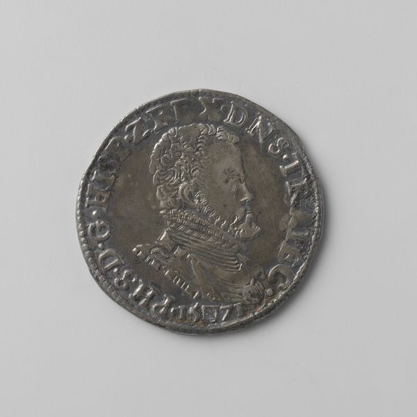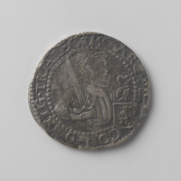Curator: Here we have a Dutch silver coin, or 'Zeeuwse halve zilveren dukaat', produced in Zeeland in 1762. It's a small piece, primarily monochrome in tone. What strikes you first? Editor: The figure dominating the coin has an intriguing stance – casual, almost nonchalant, but the objects he carries suggest something important is happening. The sharp geometric shapes also suggest a certain rigidity in design. Curator: That figure embodies Zeeland. Notice he is leaning on the province's coat of arms. This act emphasizes the foundational support he—and symbolically, Zeeland itself—provides. And, what do you make of the items that he bears? Editor: One appears to be a pike, perhaps denoting authority or martial power. The other almost looks like a small architectural structure - very geometric. Curator: The pike signifies justice and governance, while what you observe as architecture is meant to be scales which are evocative of balance and trade that sustained the region. Together they form a clear message: power resting on judicious action. Editor: It's fascinating how these potent symbols, miniaturized onto a small metal surface, spoke volumes about identity and authority in 18th-century Zeeland. Did all citizens understand these embedded ideologies? Curator: The symbolic language was undoubtedly clear to those holding power but it also imprinted those messages into collective awareness, even for those outside governing circles. Currency itself functions as a repeated lesson on who holds power and its attributes. Editor: So, in effect, this little coin operates as a portable propaganda piece. Its impact goes far beyond its monetary worth. Even now it causes us to analyze the role images play in cultural identity and enforcement. Curator: Precisely. It demonstrates the power inherent within symbols, their continued influence shaping collective understandings. Editor: The design reflects that, utilizing limited space to create multiple impressions about power and value in simple clear lines. Curator: And that potent symbolic language extends beyond aesthetics – speaking directly to historical values and power dynamics still relevant to consider. Editor: Leaving us contemplating which values persist, and how effectively the past transmits ideas into the present.