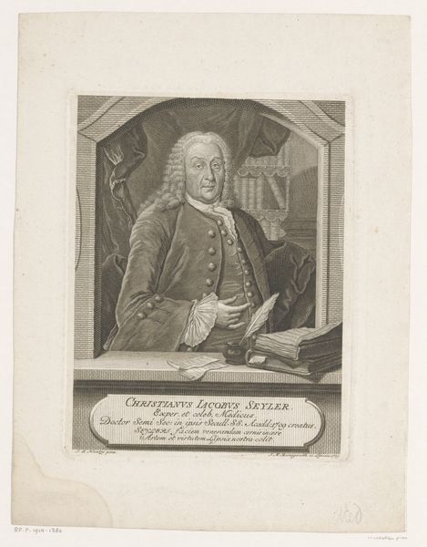 Curator: Take a look at this portrait. Jacob Houbraken created this engraving of Pieter van de Poll sometime between 1749 and 1796. The portrait immortalizes Van de Poll, who was once the mayor of Amsterdam. Editor: The overall impression is so serious. The man portrayed is captured in meticulous lines; you feel like the artist hasn’t missed a single detail of his elaborate wig. He’s framed within an oval that softens some of the formality. It has a somber air, doesn't it? Curator: Definitely. The oval is actually quite telling. Think about what it signifies—an egg, potential, and in this case, the continuity of power and influence within Amsterdam's elite circles. He’s gazing directly out, imposing in a way, connecting with the viewer even centuries later. Editor: Precisely. The artist masterfully rendered his textures, you almost want to reach out and touch the curls of his wig and the velvet of his robes. I wonder, what does the act of memorializing through print mean for our understanding of the subject? Is it intended as a mere depiction, or is something more? Curator: The symbolism speaks volumes. Look at how deliberately his garments and title are displayed; It's not only a form of record keeping but a conscious construction of an identity, embedding Van de Poll in the cultural memory. Through its reproducibility as a print, Houbraken’s work democratizes access to the image while further enshrining the sitter’s legacy. Editor: Absolutely! It serves as a public assertion of authority and status, meant to permeate societal consciousness and shape lasting perceptions. Each copy acts as a seed to embed these virtues. It's fascinating to consider how portraits like these solidify cultural narratives. Curator: Indeed. Considering how history remembers him, or perhaps chooses to remember him through works like these, is something to ponder. Editor: Definitely. It feels that even now, viewing this print invites questions about memory and reputation. It is pretty interesting when you stop and think about it.