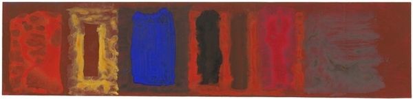 Editor: Here we have Mark Rothko's "Untitled (Study for Seagram Murals)" from 1958-59, an oil on canvas piece. The arrangement of colors feels very deliberate, yet also somewhat somber. What formal qualities stand out to you in this piece? Curator: The primary element here is, unequivocally, color. Note how Rothko employs rectangular forms not as representational figures, but as vehicles for color. Examine the saturation. Consider the density of pigment, and how variations within each block of color invite visual contemplation. Observe also the edges of each form; are they sharp or blurred? Editor: The edges definitely seem blurred, almost bleeding into the surrounding colors. How does that impact our perception of the work? Curator: This blurring serves to negate clear delineation and thereby foster a sense of continuity across the canvas. The interpenetration of color generates a visual dynamism. Consider the formal relationships established between these shapes and the background; does the background serve to enhance or diminish the individual forms? Editor: I think it enhances them because the background is a deep hue of color. You know it kind of contrasts with each form within this study. Curator: Precisely. It is through these formal contrasts, through the careful orchestration of color and form, that Rothko achieves a depth that transcends mere aesthetic appeal. Have you discovered a newfound awareness of Rothko's visual language? Editor: I have! The way the colors interact is much more complex than I initially perceived. Focusing on composition and colour saturation offers a clearer reading of Rothko's abstract language.