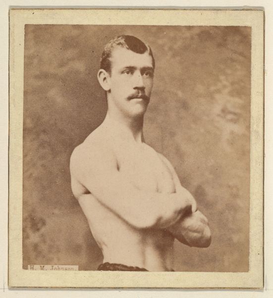 Curator: This is an albumen print from 1866 by Jeremiah Gurney, titled "William E. Van Wyck". What strikes you first about it? Editor: An interesting pose – there is definitely an underlying muscular strength about him and, although sepia, it is very intense, perhaps from the nature of the print? A very capable man with strong fists ready to deliver a KO! Curator: Albumen prints, popular at the time, were made using egg whites, producing a smooth surface perfect for capturing fine detail and depth of tone, key in portraits like this, where the sitter’s features and physique are highlighted, revealing Victorian ideals of athleticism and manliness. Editor: Indeed, there’s an inherent symbolism there – the mustache, the almost challenging pose with hands balled into fists – and an implied sense of personal power. One senses he feels more than confident in his time! Was he someone of repute? Curator: He may have been but with such photography, Gurney democratised portraiture, making it accessible to a wider middle class who, as they began to grow more affluent in society, sought symbols and artefacts of upward mobility. We see examples like this photograph today in Victorian homes and civic life. Editor: So, the albumen print serves as a tangible symbol of aspiration within the rising middle classes…It's almost like he is capturing this very unique, pivotal social mobility through portraiture of strong muscular men, capturing it with almost aspirational realism? Curator: Precisely. This piece allows us to analyse how visual materials actively participated in shaping social identities, both within the photograph itself and in how they were disseminated, sold and viewed by his target audience. Editor: A really fascinating intersection then of cultural performance, masculinity, photographic technique and expanding social ambition! Curator: Yes, examining the albumen print itself sheds light on 19th century production, portraiture as labour and, of course, the very nature of class representation. Editor: A cultural gem then, viewed through the lenses of production as well as social and psychological symbolism.