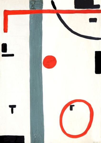 Curator: Before us we have an untitled work, created in 1972 by Marcelle Cahn, a pioneer in the realm of abstract and non-objective art. It presents as a digital print on a square format. Editor: My first impression? It's like a Mondrian trying to be minimalist, but got distracted halfway through by a game of pick-up sticks! I love the playfulness, though. Curator: Playfulness is certainly one reading. What strikes me is the almost mathematical precision within the composition. Notice how each element, the circles, the rectangles, and the connecting lines, exist in carefully calibrated tension with one another. The color palette—restricted to black, red and blue—underscores this austerity. Editor: Austerity, really? To me, it's more like a secret code. Those shapes, scattered across the canvas—they remind me of musical notes dancing on a stave. Perhaps it’s an unfinished symphony, or maybe a map to a hidden stash of joy. Curator: I find the sparseness compelling, actually. It emphasizes the formal relationships. For example, the progression of red dots anchored to a vertical line, the semi-circles balanced asymmetrically... Cahn is playing with spatial relationships. This echoes Constructivist principles but also predates aspects of digital art and its algorithmic aesthetic. Editor: That's fascinating! It does feel ahead of its time. For me, though, it taps into a more primal feeling – it stirs the same feelings I get when spotting those mysterious crop circles in Wiltshire, somewhere between dread and fascination. Cahn gives order, but hints there’s still chaos in the code. Curator: Well, your interpretation certainly adds layers! For me it demonstrates how effectively an artist can achieve a delicate visual balance through simple shapes and color combinations. It's a successful application of structured design, almost diagrammatic in its efficiency. Editor: Yes, but beneath its structured appearance, for me this piece holds the possibilities of a visual poem—open, inviting, with subtle provocations of a mind grappling with representation, in both artistic and social systems of language. It presents an alternate order, a delightful enigma of form, daring you to look closer, even at the 'simple.'