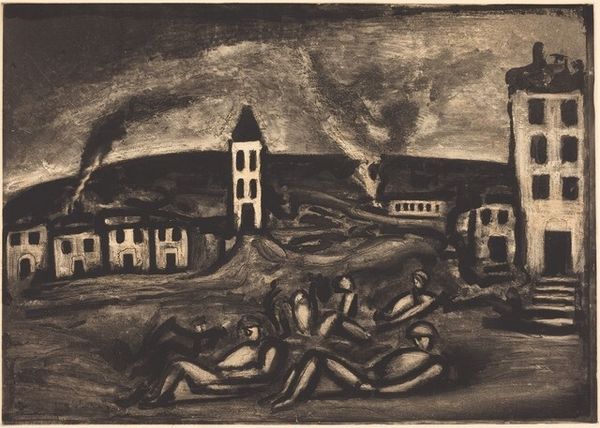 This lithograph by William Lloyd Wulf presents a scene dominated by the looming presence of mountains and a sky pregnant with storm clouds. The beach below is filled with figures, some embracing, others huddled together, evoking a sense of collective experience. The mountains, universal symbols of steadfastness and spiritual height, here seem to bear down on the figures, reminding me of Caspar David Friedrich's lone wanderers dwarfed by nature's grandeur. Yet, these are not solitary figures, but a community, seeking solace or perhaps diversion from the weight above. The turbulent sky, reminiscent of the Baroque era's dramatic use of chiaroscuro, adds to the emotional intensity. Like the ever-churning waves, human emotions are in constant flux. This echoes through centuries, from ancient myths to modern anxieties. The beach then becomes more than a location; it transforms into a stage for the drama of human existence, a powerful force engaging viewers on a deep, subconscious level. The cyclical progression of symbols such as these, constantly resurfacing and taking on new meanings, are the threads that weave the tapestry of cultural memory.