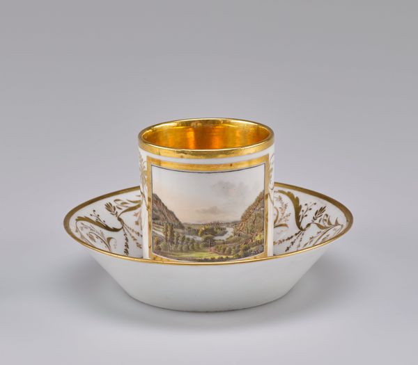 Editor: This is the lid of a teapot made from porcelain around 1809-1814, painted with a tiny landscape, created by the Koninklijke Porseleinfabriek Dommer & Co. The detail is quite charming, almost miniature. How do you read its visual language? Curator: Focusing on the formal elements, observe the contrast between the smooth, white porcelain surface and the delicate, painterly application of the landscape. The Rococo influence is palpable, evidenced by the asymmetrical balance of the composition and the curvilinear lines that define the landscape elements. How does the gold trim function in relation to the central image? Editor: It seems to frame the miniature landscape, but also draws attention to the lid's shape itself, setting it apart. Curator: Precisely. The interplay of geometric shapes, from the circular lid to the conical knob, adds to the piece’s complexity. Semiotically, the landscape becomes a signifier of idyllic life, framed by the gilded opulence. The function follows form here, yes? Editor: Absolutely, it accentuates that miniature landscape! I hadn’t thought of it in terms of semiotics, more in the material contrast between paint, porcelain, and gold. Curator: Consider how the artist manipulates space within such a small frame. The landscape’s depth is suggested through subtle gradations of color and value, creating an illusion of perspective. What overall impression does that leave you with? Editor: It gives an expansive feel. It almost doesn't feel as small, even with the fine brushwork of all of the detailing in the tiny buildings and individual trees. Curator: Exactly. Its strength lies in how successfully it marries form and decoration, and reminds us to look closely. Editor: Now I notice even more the interplay between the various visual elements that I initially overlooked.