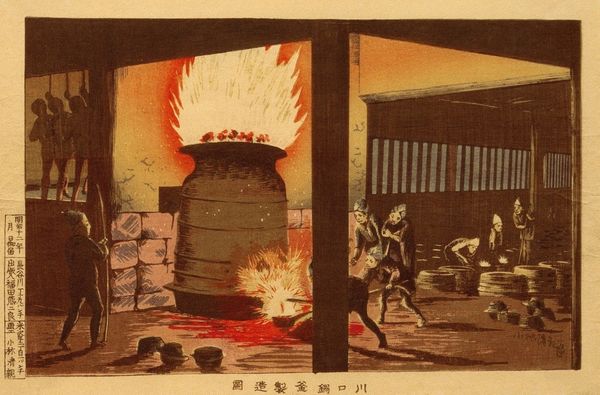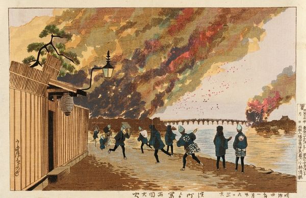 Curator: The scene is immediately captivating. There’s such dramatic contrast and depth for a woodblock print. The red sky! It's menacing, really. Editor: Indeed. What we have here is Kobayashi Kiyochika's "Outbreak of Fire Seen from Hisamatsucho," created in 1881. It's part of the ukiyo-e tradition but pushes beyond simple pleasantries. Consider the context: Kiyochika was navigating a rapidly modernizing Japan. His work reflects the societal anxieties and changes that came with it. Curator: So you're suggesting that even this depiction of utter destruction serves as a reflection of, and maybe a resistance to, the changing social order of the Meiji period? Editor: Precisely. This print is an exercise in materiality—how Kiyochika used woodblocks, ink, and paper to portray something so immediate and potentially devastating, almost akin to disaster photography but with layers of meaning baked into the process itself. The labor, the individual choices... it moves beyond craft into calculated artistry. Curator: I do see the layering, particularly in how the figures are arranged. It speaks to a communal, public experience. We see individuals responding to the disaster, creating this social spectacle. Do we know the actual social consequences for those represented here, the displaced, and how this incident, like others, may have altered public consciousness? Editor: These kinds of disasters undeniably affected how people organized within cities. This imagery circulated widely and undoubtedly played a role in the evolving social dialogue and reform of city infrastructures. Woodblock prints democratized art, placing this important imagery within the daily life of the society depicted. Curator: Thank you, understanding that background of societal shift informs my viewing experience. Editor: My pleasure. Exploring Kiyochika's production through this social lens offers new avenues into appreciating both its technical accomplishment and deeper symbolic resonance.