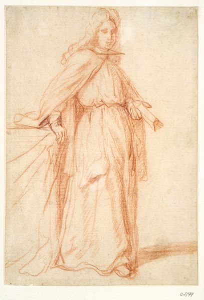 Andrea Boscoli made this red chalk drawing, "Kneeling Figure from the Back," sometime during his career, before 1608. The subdued palette focuses our attention on the figure’s pose, which projects a sense of vulnerability. Boscoli masterfully uses line to define form and volume. Look at the way the lines vary in thickness and pressure, creating a subtle play of light and shadow on the figure. This technique, common in preparatory sketches, allows us to see the artist's process of exploring form and composition. The figure is cropped in such a way that we are given only clues, making it hard to define the subject, or understand the purpose of the work. The structural integrity of Boscoli’s drawing lies in its precise articulation of form through line. It reveals the artist’s deep understanding of the human figure and his skill in translating three-dimensional form onto a two-dimensional surface. The drawing exists as both study and artwork, opening possibilities for ongoing interpretation.