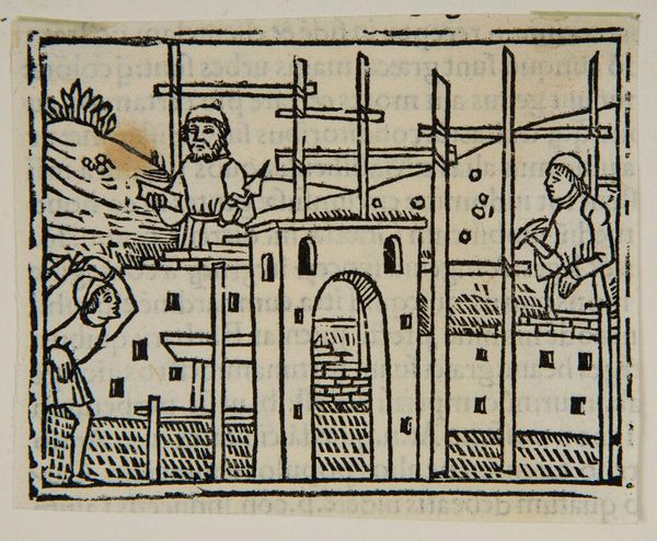 Curator: This is "Illustration XIV," an intriguing anonymous work held here at the Harvard Art Museums. Editor: I am drawn to how raw it feels. There's an almost childlike quality to the lines, yet it portrays something monumental. Curator: Absolutely. The inscription "ESDRAS" suggests it depicts scenes from the biblical Book of Esdras, likely focusing on the rebuilding of the temple in Jerusalem. Editor: The temple looks as if it's pieced together by children! I suppose this adds to the narrative that it was built by the people. Curator: The simple woodcut technique, and its appearance in printed books, made scripture accessible to a wider audience than ever before. Editor: It reminds me that art doesn't need to be technically perfect to be profoundly impactful. Curator: Indeed, its power lies in its accessibility and the story it tells within a specific historical context. Editor: A beautiful reminder that even imperfect lines can construct a powerful story.