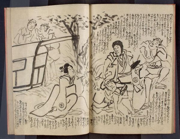 Curator: Looking at this page from Hokusai’s Manga, volume three, held here at the Harvard Art Museums, I’m struck by the sheer diversity of subjects, almost like a cabinet of curiosities. Editor: It's incredible to see such playful sketches, almost like a visual encyclopedia of 19th-century Japanese life rendered with so much ink, paper and woodblock printing! Curator: Exactly! The Manga were crucial in disseminating images beyond elite circles, shaping visual culture with their accessibility. The mass production using woodblocks speaks volumes about democratizing art. Editor: The composition, too, juxtaposes geometry with fluid human figures; each panel reflects the social fabric of its time. It’s a fascinating window into the socio-political influences shaping Hokusai’s world. Curator: Indeed, analyzing the paper, ink, and printing techniques reveals the material conditions of artistic production back then. It really shows how art and craft merge. Editor: Agreed. This piece exemplifies how art reflects and shapes cultural identity and historical narrative. Curator: Reflecting on this Hokusai page, the intersection of material and artistry provides a unique historical snapshot. Editor: Ultimately, it highlights the powerful role art plays in shaping our collective memory.