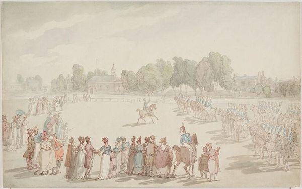 Curator: Thomas Rowlandson, born in 1756, captured this lively scene of a horse race in a print titled "Preparing to Start." The composition teems with figures, a real explosion of activity. Editor: Yes, it feels like a bursting forth. The eye bounces all over, doesn't it? So much nervous energy, like the horses themselves are itching to be off. Curator: The scene is wonderfully layered. The artist uses line and color so economically, yet manages to convey depth and movement. Look at the way the crowd blurs into a single mass. Editor: It’s almost as if Rowlandson captured not just a horse race but the very spirit of early sporting culture—the thrill, the anticipation, even the chaos. The drawing is full of people, rich and poor all jumbled together, betting on the outcome. Curator: Exactly! Rowlandson was such a clever observer of human nature; he really knew how to capture a particular time. It's more than just a scene; it's a social commentary with a wink. Editor: I agree. It's fascinating how a few simple lines can convey so much. I’m left thinking about the sheer exuberance of the event. Curator: Well, I'm left thinking about whether or not to place a bet next time!