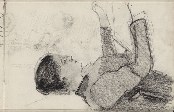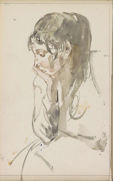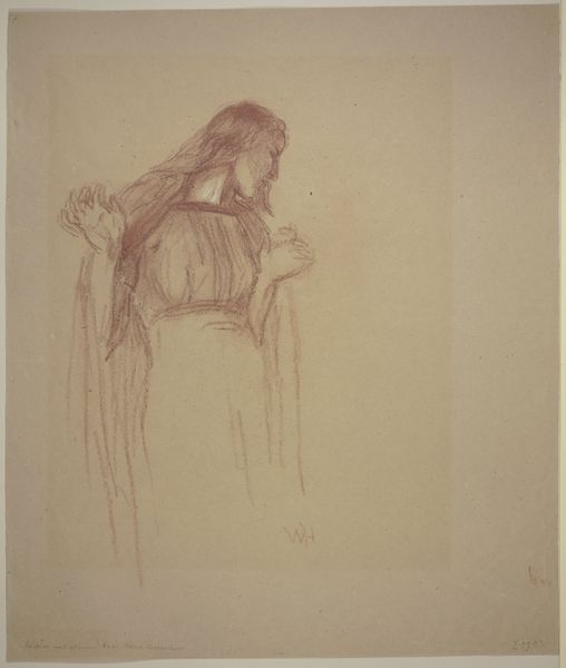 Curator: Looking at "Femme En Peignoir Rouge Se Coiffant," a pastel drawing potentially from the late 19th century by Edgar Degas, I'm immediately struck by its apparent simplicity and the softness of its lines. It has a dreamlike quality. Editor: Dreamlike is a perfect way to describe it. I can’t help but focus on how Degas seems to be playing with the representation of women and femininity in his time, creating this sense of intimacy in the everyday through the domestic scene. The fact that the female figure appears lost in a quotidian practice brings forward larger debates concerning the autonomy, confinement, and privacy of women in 19th-century bourgeois culture. Curator: I see what you mean. And formally, the color composition creates this sensation as well. Degas really captures that mood through his visible, layered pastel strokes, building texture to evoke a feeling of reverie, rather than photorealistic detail. Notice how the red of the robe contrasts with the neutral green and yellow of the background to give volume to the figure. Editor: Exactly! Beyond the visible construction of the artwork, I see in it a visual manifestation of the changing roles ascribed to women. This aligns with ongoing concerns of representation, but, significantly, through a distinctly feminine lens that defies conventional portraits. Curator: It's a captivating exploration, balancing artistic skill with what seems a conscious effort to portray his subjects authentically. Degas makes a very thoughtful consideration about the role of color as an evocative force. Editor: Yes, the intimism within Degas's figurative artwork speaks volumes about the negotiation between visibility and invisibility, offering audiences space to analyze how norms shape representations. Curator: The color itself acts like a symbol of raw emotion, making it an intriguing intersection of technique and symbolism. Editor: I agree; I hadn’t thought of it that way. Considering the complex interplay between artist, model, and spectator opens many avenues for understanding not just the artistic merit, but also the social commentary embedded within it.
