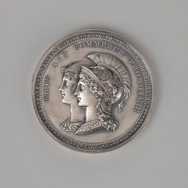 Editor: Here we have "Louis XVI and Marie Antoinette," a metal relief crafted in 1781 by Pierre-Simon-Benjamin Duvivier. It's currently housed at the Metropolitan Museum of Art. Initially, it strikes me as rather cold, almost clinical, despite its decorative qualities. What do you see in this piece? Curator: I see a potent blend of aspiration and omen, etched into metal. The profiles of Louis and Marie Antoinette, rendered in the cool detachment of Neoclassical style, are surrounded by inscriptions. Metal, especially in relief, holds a sense of permanence; yet here, it serves as a poignant reminder of a dynasty on the brink. The choice of profile echoes ancient Roman coinage, attempting to imbue the French monarchy with similar gravitas, a cultural and psychological connection. Editor: That's fascinating – the idea of invoking Roman imagery. So, do you think the artist intended to create a symbol of stability, even though, as you say, the monarchy was unstable? Curator: I believe Duvivier was certainly operating within the established visual language of power. But hindsight is a powerful tool. The profile, turned away, becomes symbolic of a court isolated, not seeing the storm gathering. This form, the medal, originally created to commemorate or celebrate, unintentionally became a stark artifact from a tumultuous period, and carries all the emotional weight that comes with such historical irony. Even the materials – the cold metal itself – anticipates something unyielding. Editor: So, the symbols of power and permanence became ironic markers of their downfall. That's really changed how I see it. Thanks! Curator: The beauty of art lies in its ability to accumulate layers of meaning across time. Seeing how symbols can shift and evolve adds such depth to our understanding of art and history.