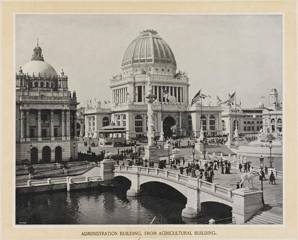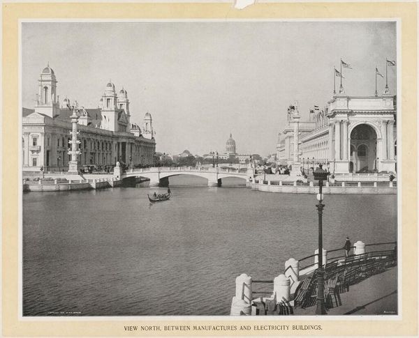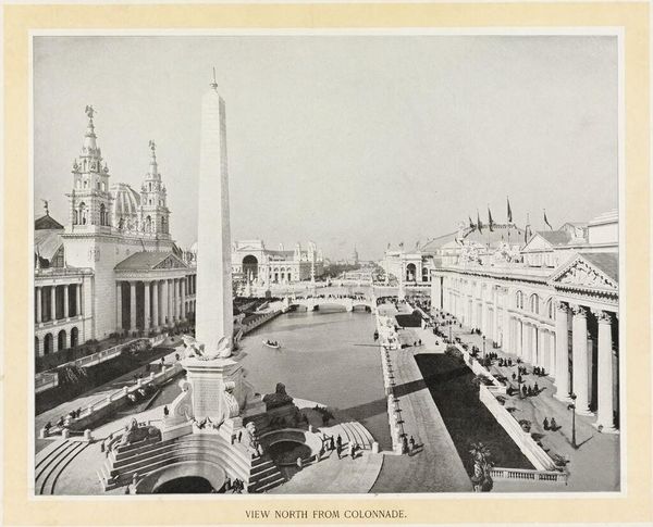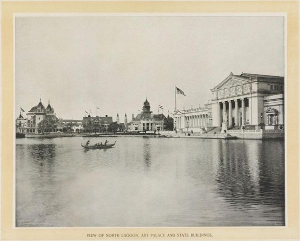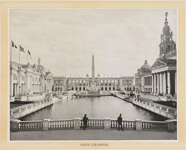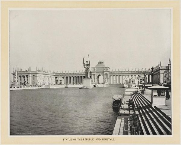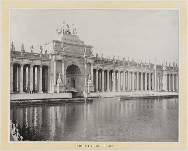 Editor: This is William Henry Jackson’s "Electricity Building and Fountain, World's Columbian Exposition." I’m struck by how monumental it feels. What symbols and imagery stand out to you? Curator: The building itself acts as a symbol of progress, an imposing architectural feat representing the electrifying future. The orderly rows of columns speak of Enlightenment ideals and aspirations of order and reason. Editor: So, it's more than just a building; it's a statement? Curator: Precisely! And the fountain? Water, a source of life, juxtaposed with the novel force of electricity. It signals a harnessing of nature, a mastery…or at least, the aspiration of mastery. What do you make of that lone figure by the water? Editor: Maybe a symbol of humanity contemplating progress? I never would have noticed that! Thanks!