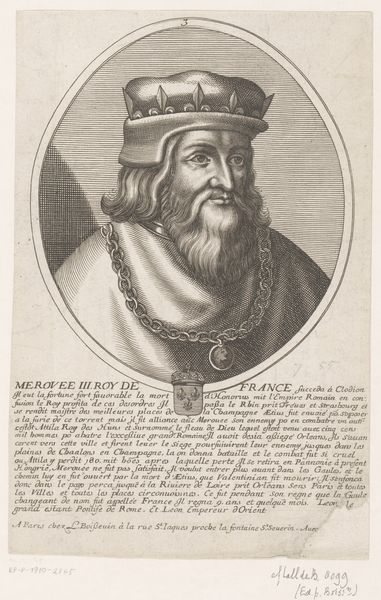 Curator: We're looking at a 1650 print by Cornelis Visscher, titled "William I, from Principes Hollandiae, Zelandiae, et Frisiae." It’s currently housed at The Art Institute of Chicago. What's your initial impression? Editor: The detail is astonishing. Just look at the rendering of textures – the soft folds of his turban, the glint of light on the jeweled clasp, the almost palpable roughness of his beard. It's captivating, especially for a print. Curator: Indeed. Visscher was a master engraver. What's particularly interesting here is the contextualization of William I within a historical and political framework. This print was part of a series depicting the counts of Holland, solidifying their legacy. Notice the Latin inscriptions; they highlight William's lineage and achievements. It serves as a powerful statement of authority and historical continuity, created during a time of political maneuvering. Editor: Yes, but stripped of its historical significance, the piece remains striking purely on a visual level. Observe the use of the oval frame, decorated with foliage, it encloses the portrait. Visscher directs the viewer's focus inwards, prioritizing the subject's facial expression. The play of light and shadow accentuates William’s features creating depth and a strong sense of presence. It is these design qualities that invite sustained viewing. Curator: I agree, though the deliberate choice to portray William in what appears to be orientalist attire does contribute to how the viewer perceives this piece. He may have wanted to associate William I with traits of power and expansionism as Islam at the time was considered very powerful. It would be insightful to consider the visual politics at play. Editor: While the intent adds meaning to the piece, that doesn’t alter my understanding of his command of line and form, that gives the engraving so much life, so much energy. It's an admirable demonstration of the engraver’s artistic ability, which is still affecting to a modern viewer. Curator: An engraving is indeed a democratic art form. Prints allow for a wide distribution of images of this caliber, which in turn contributes to the formation of political opinion on rulers of old. The print is a political instrument. Editor: A very persuasive, yet visually striking piece. I may now consider engravings in a new light, beyond the lines that they use to create shapes, shadows and ultimately depth, a demonstration of what images can accomplish.