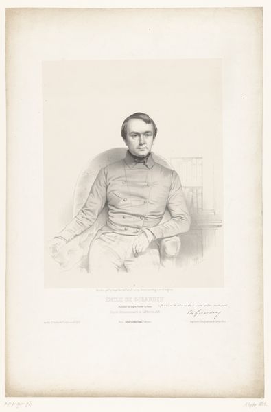 This is a portrait of Paul Delaroche, made by Charles Baugniet using lithography. The grainy texture and tonal range are achieved through the manipulation of greasy crayon on a stone matrix, a process that requires significant skill and control. Consider how the artist captures the nuances of light and shadow, creating depth and form with what is essentially a very manual printing process. Look closely, and you will see a contrast between the smooth areas and the more textured passages, achieved through varying pressure and technique. Lithography was a key technology for mass media, allowing images to be reproduced and disseminated widely. It democratized image-making, offering a means of visual communication beyond traditional painting. The act of printing transforms artistic creation into an industrial enterprise. Understanding this interplay between art, labor, and consumption is crucial to understanding the significance of this portrait and its place in art history, blurring the lines between fine art and craft.