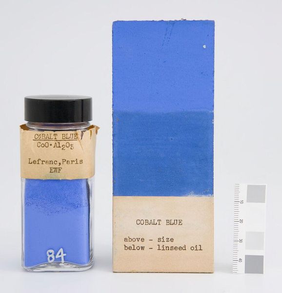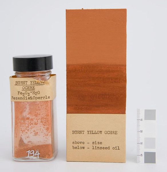 Curator: This is 'Golden Ochre,' manufactured by F. Weber & Company. It's a pigment, pure potential, held within a simple glass jar. Editor: It feels deeply earthy to me. The color evokes sun-baked landscapes and ancient pottery shards. It’s quite grounding. Curator: Ochre has a fascinating history. It's been used by artists for millennia, with evidence of its use dating back to prehistoric cave paintings. Its enduring appeal lies in its accessibility and permanence. Editor: It's primal in a way. This shade is linked to the very first expressions of art and humanity. It stirs something deep within our collective memory. Curator: And F. Weber & Company played a significant role in making these materials accessible to a wider range of artists, shaping artistic practice in its own way. Editor: So, this seemingly simple jar embodies layers of art history and cultural meaning. It’s far more than just a color; it’s a connection to the past.