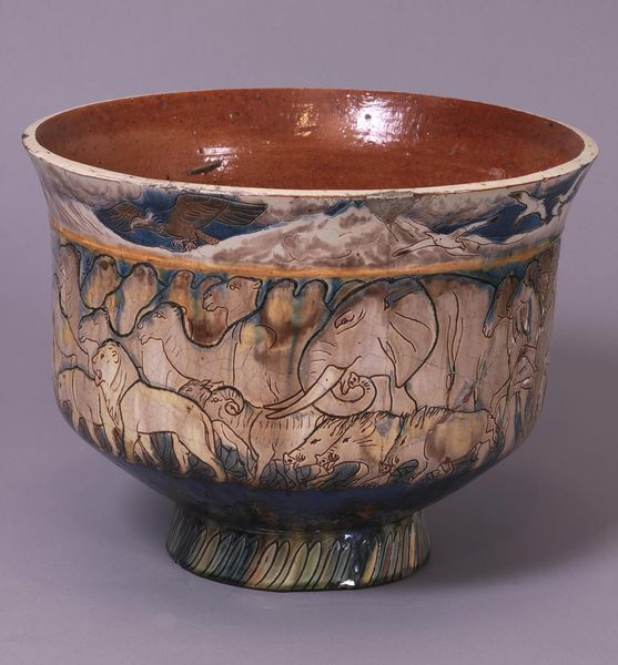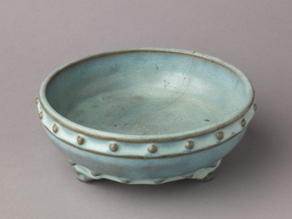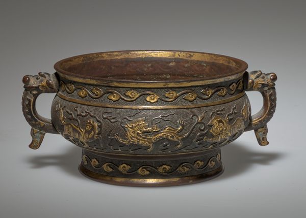 This gilded bronze censer is shaped like a Bronze Age ritual vessel form known as gui. It is cast and carved in relief, displaying a wave pattern in the main body, with eight mythological ocean animals, including sea horse, lion, elephant, and dragon, all accented with gilding. The center of the base is inset with a large, rectangular cartouche containing a six-character seal-script mark, which reads, “Made by Zhu Zhenming of Yunjian.” Yunjian is present-day Songjiang near Shanghai, also the hometown of metalwork master Hu Wenming. Zhu worked in Hu’s workshop, where he completely assimilated the master’s style and then became an independent artisan producing bronze objects that appealed to scholars’ tastes.