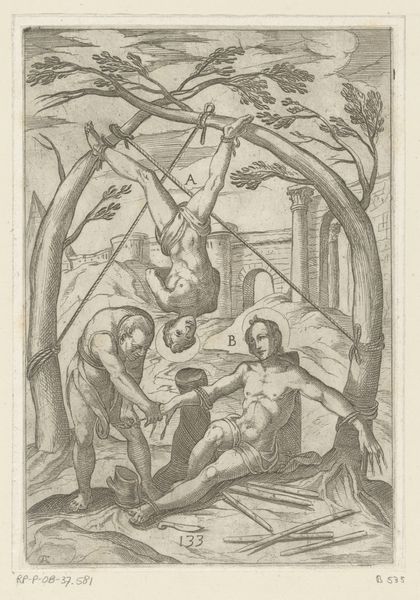 Curator: This engraving, whose title translates to "Child sitting in shadow by a tree, crucified angel", was created between 1590 and 1624 by Boëtius Adamsz. Bolswert. It’s currently held in the Rijksmuseum. What are your first impressions? Editor: Stark. The high contrast gives it an almost brutal feel, and that angel nailed to the tree is frankly disturbing. The figure kneeling below is a compelling focal point, drawing me into some implied narrative. Curator: Absolutely. The engraving masterfully uses light and shadow to create this dramatic tension. Notice how the angel, while central, is literally pinned to the tree. What symbolism might the ‘crucified angel’ convey in relation to the kneeling child? Editor: That’s the compelling point! The image presents such a paradoxical allegory: salvation or suffering, innocence under threat? We might explore contemporary religious and social structures, the period's preoccupation with original sin, or perhaps Bolswert's views of the established church. The politics of imagery! Curator: Intriguing analysis. Focusing purely on its composition, I'd note the visual hierarchy. The lines of the tree and the angel's form lead directly to the child. This is supported by Bolswert's exquisite rendering of textures, distinguishing the rough bark from the soft folds of the child’s garment. Editor: Precisely, it raises further questions. Is this child seeking refuge or forgiveness? What are the politics embedded here between authority, represented by the angel nailed, and innocence, signified by the child. Curator: The context adds significant layers. This era saw profound social shifts. Considering Bolswert’s background would reveal further intentions regarding the role of religious authority at the time. Editor: Well, my initial unease has now deepened. It’s a credit to the piece’s power that it generates these unsettling but productive questions about representation and ideology. Curator: Agreed. This print displays a potent artistic dialogue between the sacred and the profane, visualized via formal elements and shaped through historical conditions.