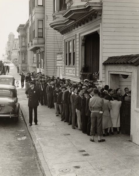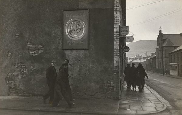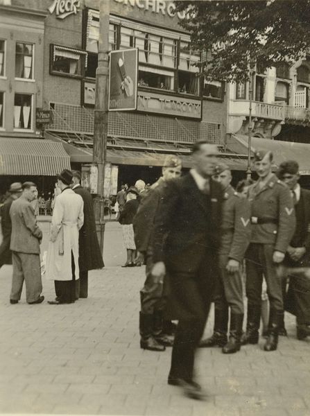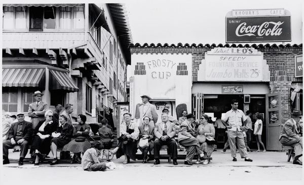 Curator: This is "Place to Meet, Luzzara, Italy," a gelatin-silver print taken in 1953 by Paul Strand. It exemplifies Strand’s commitment to realism, portraying a group of people outside what appears to be a storefront. Editor: My first impression is one of stillness, and contemplation. The composition is divided in a rather stark manner, one side occupied by seated figures, the other, men poised to enter or exit a doorway. Despite the potential for dynamism, the greyscale palette and stoic expressions evoke a feeling of quietude. Curator: Observe how Strand uses tonality and form to structure the composition. The photograph's surface is treated with exquisite care, focusing the interplay between the light falling across the architectural setting and the shapes made by the people gathered in this public sphere. Notice also the linear precision that segments and aligns planes with the verticals. Editor: The scene seems to be charged with unspoken narratives, though. What do we know about the place Luzzara in Italy during this postwar time, for example? Are these figures a study in working-class communal life, waiting outside of shops due to limited domestic space or opportunities? Perhaps some gathering for simple conversation? Curator: I’m hesitant to prescribe so much context. If you consider Strand’s formal choices – the texture of the worn building façade, the posters creating a shallow depth of field – they create visual rhythms independent of external references. They invite appreciation based upon the picture elements, in and of themselves. Editor: And I want to also ask *who* is left out, right? I see mostly men represented here, and one older woman on the margins quietly focused on sewing. Is this exclusion merely descriptive of Italian village life in 1953 or is the lack of female representation also a conscious stylistic and social statement? Curator: We are then back to forms; notice, for example, how the subjects are organized along both sides, from left to right in each zone; the tonal value increasing gradually towards the dark aperture of the doorway as if receding into history. Editor: Yes, well, such visual strategies speak to themes that touch on how history and societal structures dictate ways of life. Thanks for highlighting how those tensions play out formally and representationally here.