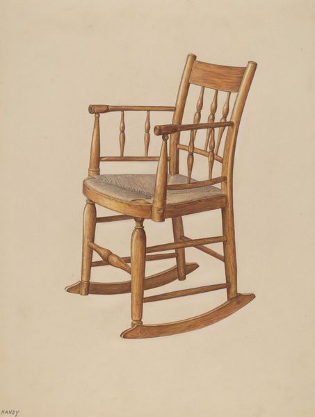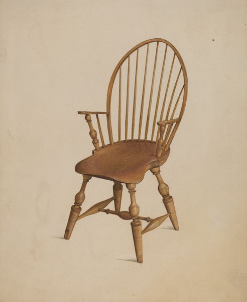 Curator: This unassuming watercolor, simply titled "Windsor Armchair," caught my attention. It's dated around 1940 and created by Donald Harding. It presents itself with the quietness that almost suggests a craftsman's schematic. Art Historian: Yes, and there’s something subtly powerful in its quietude, isn't there? This piece speaks volumes about the vernacular tradition within American art of the period. It elevates an everyday object, reflecting a broader social interest in depicting the common and relatable during the early to mid 20th century. Curator: I am really struck by the attention paid to the wood grain. It invites a certain appreciation for process. One is left pondering over the stages required to fashion and manufacture furniture like this – thinking about trees felled and planks cut and the labor needed to bring the piece to life. You almost feel the texture here. Art Historian: Absolutely. And I'd argue the very act of painting the chair like this transforms it, right? The object moves out of being merely functional into something examined, documented, memorialized on paper. Think about how government art programs of the era often aimed to record Americana; this fits within that impulse, lending the object significance far beyond just its utility as a chair. Curator: Good point! I see those New Deal connections now, the celebration of local industry. There’s nothing precious, in the sense of "high art" values, about rendering the item as accurately and lovingly as possible. Harding’s decision to use watercolor further democratizes the image, a deliberate and potentially political artistic choice, maybe to appeal to the public eye at the time. Art Historian: Exactly. Displaying something like this acknowledges that artistic interest, subject matter and creative effort reside not just in fine art, but in what people use, produce and ultimately live amongst day by day. It’s an artistic testament to broader cultural shifts occurring. It subtly shifts perspectives on what constitutes cultural heritage itself. Curator: So true, and this close examination does invite a new level of respect for what appears plain initially. Art Historian: Yes, it's really revealing how close examination shifts one’s perspective of both this image as an artistic rendering of a Windsor Armchair but equally the social context in which that item holds value and deeper cultural meanings.