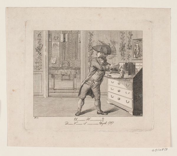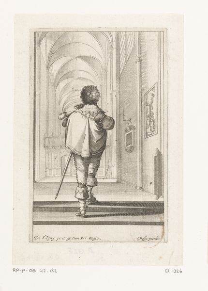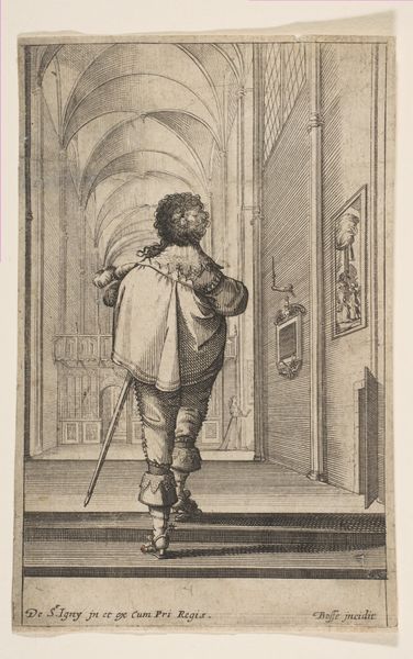 Curator: Let’s turn our attention to “La Noblesse Française à l’église,” or "The French Nobility at Church," an engraving made by Abraham Bosse around 1628 or 1629. It's held here at the Rijksmuseum. Editor: My first thought is about the performative aspect here. The nobleman, quite self-consciously posed against that soaring church architecture... It speaks to status. Curator: Precisely. Consider the social context. Bosse was meticulously documenting the clothing, manners, and spaces of the French aristocracy under Louis XIII. This print is about portraying, and perhaps subtly critiquing, that very public display of noble identity. Engravings like this circulated widely, shaping perceptions and fueling fashion trends. Editor: I am drawn to his elaborate outfit. It looks like there are swords dangling off of his waist. All those details - the high collar, puffed sleeves, ornate shoe rosettes–it reads as symbols of privilege and social performance. The weight of such material can affect identity. Curator: And notice the church itself. The towering gothic arches, stained-glass windows implied by the grid, it acts as a backdrop, legitimizing this performance of nobility. It shows power structures playing out on several levels. Editor: It's more than just showing it; the building speaks about God and Country and their alignment under his fancy outfit. And again with the shoes and their rosettes - not very practical for everyday life. Those could be difficult to acquire for someone less rich. Curator: What fascinates me is the printmaking process itself. Think of the skilled labor and specialized tools needed to create those delicate lines and textures on the copper plate. This print made the habits of the elite accessible to those outside their closed circle. How revolutionary. Editor: Yes, it truly blurs lines between documentation, propaganda, and artistic commentary. It almost asks questions regarding not just "What are we seeing?" but "What is being sold to us?". It's quite revealing of cultural values and ambitions. Curator: Agreed, I now appreciate how seemingly straightforward genre painting offers a surprisingly complex reflection of its time. Editor: Me too! Focusing on symbols brings a whole new perspective to understanding production constraints and intended audience.