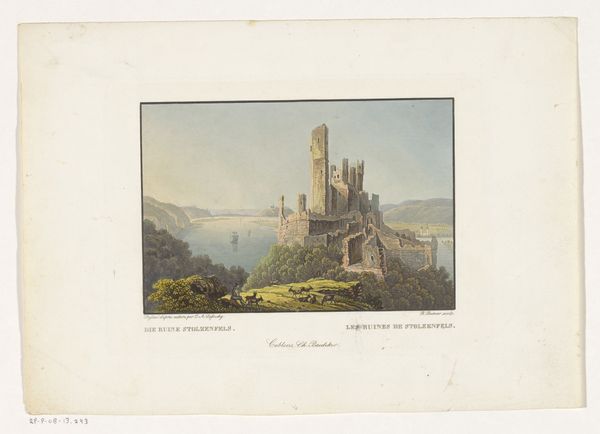 Editor: This watercolor and ink drawing, "Die Oberburg (Boosenburg) und die Niederburg (Brömserburg) bei Rüdesheim am Rhein," was created in 1803 by Georg Melchior Kraus. It's quite a detailed depiction of these castle ruins. What do you see in this piece, considering the time it was made? Curator: I see a pointed reflection on the socio-political currents swirling through Europe at the time. Consider that this piece was created during the rise of Romanticism and burgeoning nationalism. Kraus isn’t simply painting ruins; he’s participating in the construction of a national identity. How are ruins typically viewed and presented in artworks, and how does that influence how people see history? Editor: Often ruins are seen as symbols of the past glory or the transience of human achievement, right? This image, with its serene landscape, seems to glorify German heritage somehow. Curator: Exactly! Kraus's careful depiction of the ruins contributes to a particular narrative: one where a romanticized medieval past serves as the foundation for a shared cultural identity. And look at the presence of everyday people in the foreground; they humanize the scene, bridging the gap between the present and the historical weight of these structures. How do you think the decision to include people affects our understanding? Editor: It makes it feel less remote, maybe more…personal? It implies the ruins aren’t just remnants, but part of an ongoing story. Curator: Precisely. This image, viewed through the lens of its historical context, speaks to how art can be mobilized in shaping collective memory and national consciousness. Art like this wasn’t just decorative. It was part of a much larger cultural and political project. Editor: That’s given me a totally different perspective on landscape art; it's not just about scenery. I had no idea it could be so tied to social and political agendas. Curator: And remember, art continues to be a force in constructing and critiquing the narratives we tell ourselves about our past, and our present.
