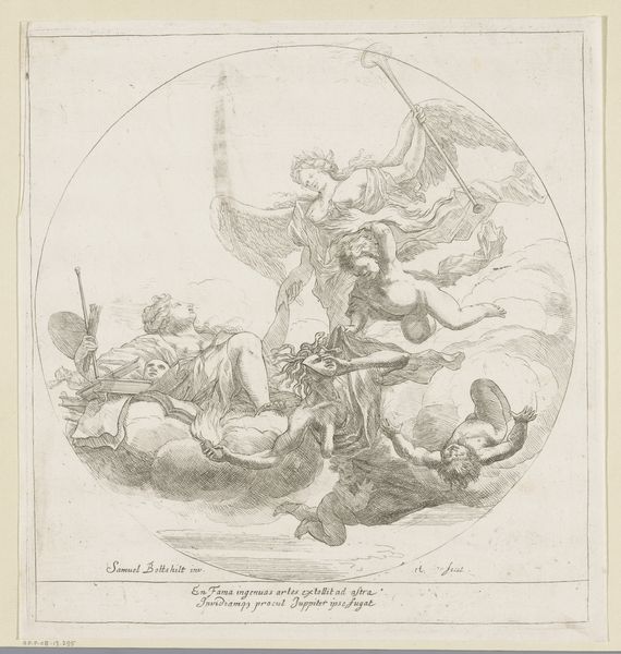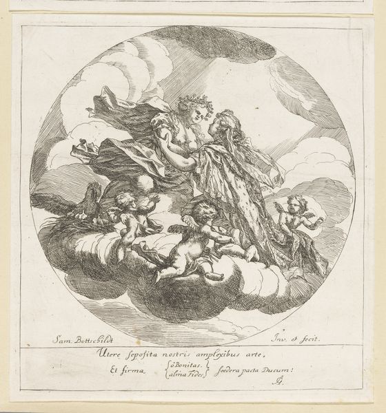 Editor: We're looking at "Wealth, represented by a woman seated on clouds and surrounded by putti, one of whom is pouring coins," a drawing or print from sometime between 1725 and 1775, by Carlo Innocenzo Carloni. There’s a kind of casual extravagance in the whole composition… What do you make of this, especially considering its historical context? Curator: It's fascinating to consider the materials and labor that would have gone into creating both the original design and then its reproduction as a print. The engraver's skill translates Carloni’s vision of wealth into a commodity available to a wider audience, thereby democratizing the image of opulence while simultaneously obscuring the means of its production. Where does the real wealth lie here: in the allegory, in the labor of creation, or in its eventual consumption? Editor: That’s a good point. The act of making and distributing the image transforms wealth into something almost... immaterial, detached from physical resources. Does the print, as a commodity itself, influence the way we see wealth? Curator: Absolutely. Consider the social function of prints during this era. They circulated widely, propagating ideologies. This image presents wealth as divinely sanctioned, a vision propagated to reinforce social hierarchies. It glosses over the material realities and exploitation often inherent in the accumulation of wealth. It almost seems to celebrate the *idea* of it, rather than actual labor or commodities. Do you find that disconnect interesting? Editor: Yes! It's a disconnect between the subject—wealth, often gained through labor and resources—and the object itself—a readily available print, almost divorced from the process of creating tangible wealth. Something about that feels really significant. Curator: Precisely. By focusing on the materiality of the print and its circulation, we gain insight into the social construction of wealth itself. It challenges us to question who benefits from this representation and what purposes it serves. Editor: It really flips the reading on its head. I initially just saw a Baroque representation, but now I'm considering the print as a form of labor and a commodity itself. Thank you! Curator: And thank you; examining art through the lens of materiality always enriches our understanding.