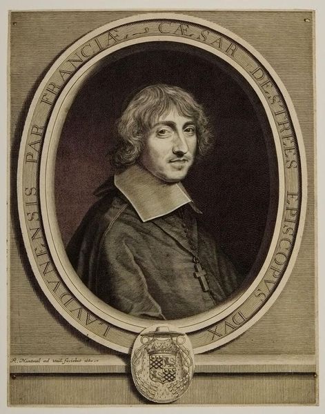 Curator: This is Robert Nanteuil's portrait of Ferdinand de Neufville. Nanteuil, who lived from 1623 to 1678, was a master of the portrait engraving in France. Editor: I immediately notice the stillness, the way he's captured within that tight frame of leaves, like a specimen pinned for study. There’s a sense of being observed, a quiet formality. Curator: Consider the context. Portrait engravings served a vital social function, circulating images of power and status. Neufville, presented with that crucifix, embodies the Church's influence. Editor: True, and I am captivated by the almost photographic realism Nanteuil achieves. It is incredible how the artist shows us the subject's internal state. Curator: Nanteuil's work shaped the visual language of the era, establishing a standard for portraiture. He captured not just likeness, but also the essence of social standing. Editor: The way it mixes rigidity with the softness of his curls is unexpectedly moving. It makes one think about the burdens carried by those in power. A reminder that behind the title there is still a human.
