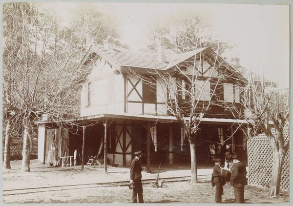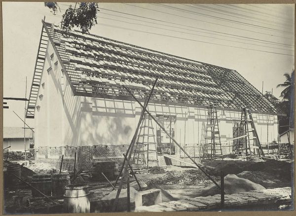 Curator: Bouwplaats, taken sometime between 1914 and 1919, it is an unattributed photograph capturing what seems to be a building under construction, with all its intricate wooden scaffolding, probably somewhere in the Dutch East Indies. Editor: My first impression? Organized chaos! All those lines crisscrossing make me feel like I’m looking at the inside of a meticulously built bird's nest. There's a stillness too, the bike leaned against the unfinished wall gives the scene an eerie yet intimate feel. It's frozen energy. Curator: It really speaks to a particular moment in the colonial architectural landscape, doesn't it? Construction wasn't just about erecting buildings. It was about asserting power and shaping urban environments to mirror European sensibilities. This building represents more than bricks and mortar. It represents transformation—a visible sign of control. Editor: You see power, I see possibility. All this construction – what could this building be? Shops, homes, something completely new? I also feel the tension of creation. This moment right before something emerges... What sort of statement were they going to make? It also hints at unseen human presence; I bet people who lived here felt displaced, uncertain… Did they look up in awe, or in anger, at all the scaffolding? Curator: Absolutely. The architecture of colonialism always involves erasure. Even a photograph, appearing objective, is laden with the gaze of the colonizer. By leaving the image un-attributed the subjects, likely local workers, are not given credit for their effort. It also speaks to an imbalance in historical records, where everyday builders are anonymized while patrons become memorialized in time. Editor: That silence around the labor is almost palpable! It adds a layer of melancholy that wasn't initially obvious. It's almost as if the photograph, beautiful as it is in its composition, whispers what wasn't supposed to be remembered or documented. How does the erasure shape the ongoing discourse in modern-day city planning? Curator: In really complex ways. You have scholars actively working to decolonize public art, address historical biases embedded in urban planning, create narratives around suppressed architectural and indigenous histories. "Bouwplaats," therefore, becomes less a historical document and more of an investigative prompt. It’s interesting how something that appears solid and fixed, a construction site, ends up revealing much of what remains unfinished and ongoing. Editor: You are right, what stands as the backdrop and the reality often is quite blurred together in this shot.