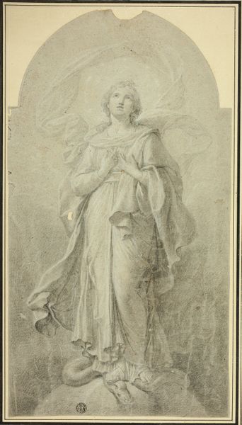 Curator: This is Jacques Kuyper's "Allegorie op de Vrede van Amiens 1802," rendered in pencil and etching. What are your initial impressions? Editor: Well, it feels... ethereal. A bit faded, like a memory. All that grey swirling around the central figure gives her a dreamy quality, doesn't it? She almost floats right out of the drawing. Curator: Indeed. Kuyper utilizes the landscape tradition here, layering it with figuration and allegory to create a meditation on a specific historical moment, the Peace of Amiens. We observe a triumphal figure bestowing a laurel, set against what seems to be the resumption of everyday life in the city behind her. Editor: Right, you've got this idealized figure up top, all flowing drapery, but then the folks down below are just…milling about. The contrast between the classical allegory and the somewhat messy, very human scene in the foreground is what gets me. It’s like peace is this lofty idea that has to filter down into the mundane. Curator: Precisely. Consider also the stylistic nod to neoclassicism; observe the figure's idealized form, echoing a kind of restrained idealism. That stylistic reference reinforces the aspirational, ordered society that the Peace promised. Note also the artist's effective modulation between pencil shading, suggesting atmospheric depth, and clean, incisive etched lines to sharpen key allegorical figures, particularly in the group on the bottom-right. Editor: Yes, and she almost blends back into the sky because the pencilwork creates these cloudlike sweeps. There's a somberness that seems to question if that idyllic, peaceful life ever arrived for those crowds celebrating below. It’s like he's saying, "Well, we can hope, can't we?" with just a hint of skepticism. Curator: One might infer such a reading. This composition uses historical painting strategies and symbolism to portray a particularly complicated era of hopeful pause. The composition asks: What kind of future will emerge now? Editor: It’s beautiful how he used such delicate techniques to explore such monumental themes, the sort that really makes you ponder how history remembers its own promises. Thanks to him we can see both the hope and hesitation. Curator: Yes, a moment suspended in the very materiality of the work.