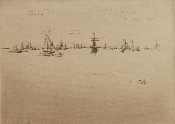 James McNeill Whistler created this drypoint artwork called "Her Majesty’s Fleet; Evening." Notice how Whistler masterfully uses line and space to evoke a serene yet commanding maritime scene. The composition is divided horizontally, with a light sky and sea dominating the upper portion. Whistler uses a few carefully placed lines to suggest the presence of numerous ships, fading into the horizon. He uses minimalism to create a scene that suggests rather than dictates, allowing the viewer to fill in the gaps, mirroring the aesthetic principles of Japonisme, which influenced Whistler. The visible plate tone adds depth, softening the contrast and lending a subdued, atmospheric quality to the print. The etching captures the quiet grandeur and power of the British naval fleet. The image uses visual elements and cultural codes to question fixed meanings, and invites us to reflect on our perception and representation of naval power.