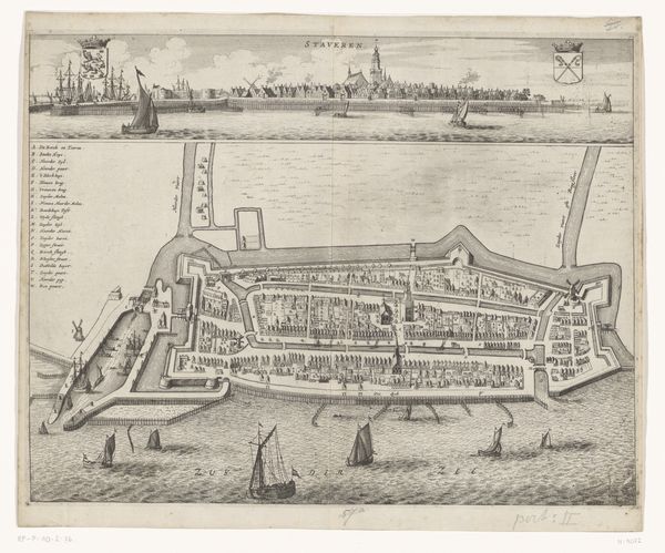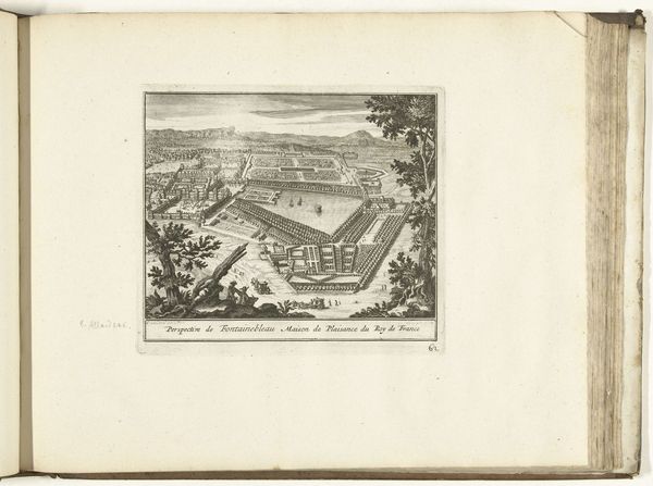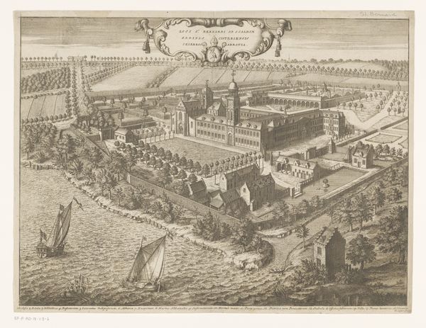 Curator: This is Sutton Nicholls' "Gezicht op Temple, het gerechtelijk district in Londen," created between 1720 and 1731. The Rijksmuseum holds this remarkable ink drawing and engraving on paper. What strikes you first about it? Editor: It's like a meticulously planned ant farm for barristers! The geometry is almost oppressive, yet there's a certain beauty in the obsessive detail, right? I mean, look at those regimented little trees. Curator: Absolutely. Nicholls’ work, falling within the late Baroque period, provides invaluable insight into the visual culture and urban planning of the time. Note how it depicts the Temple as almost a self-contained world, physically separated from the rest of London by the river. Editor: I see it! And the river’s so busy with little boats – a constant reminder that this "world" is actually hyper-connected. It’s a power center visualized, but drained of all warmth. Do you get a "Big Brother" vibe, or is that just me? Curator: Perhaps it's less about surveillance and more about asserting control through visual representation. Cityscapes like this served a political function, projecting an image of order and prosperity under a specific regime. The Baroque was often about spectacle. Editor: Spectacle… yeah, a very *organized* spectacle. I am amused how seriously people took themselves then; everything had to look important! But isn't that the function of legal structures, at the end? Create order and make things “serious”. Curator: Indeed. And notice the technique itself. The precise engraving enhances that sense of order and permanence that rulers were looking to portray in this new and prosperous age for London. Editor: Well, after that enlightening journey into history, I confess: I’ll never look at perfectly trimmed hedges quite the same way again! Now I feel the power! Curator: And I suppose, after all, it’s interesting how Nicholls uses these rigid forms to highlight something more dynamic than perhaps meets the eye at first: London as an early center of trade and power.