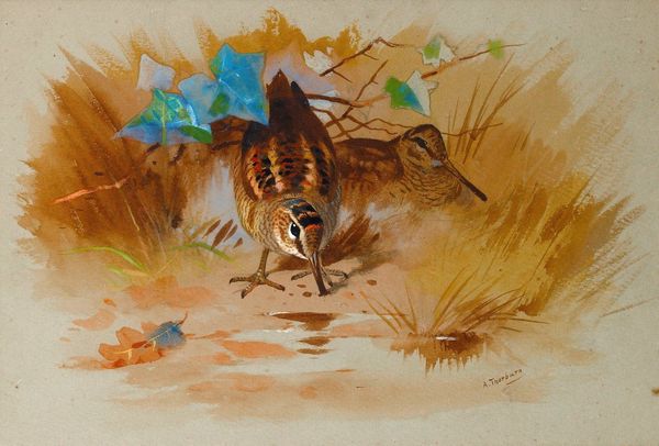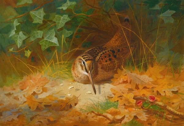 Archibald Thorburn made this watercolour, Woodcock and Young, in 1934. What strikes me about this image is the intimacy and delicacy of touch with which Thorburn has rendered the scene. The paint is applied in thin washes, allowing the white of the paper to shine through, creating a sense of light and air. The artist uses a limited palette of earthy browns, greens, and blues, all muted and blended with a soft, almost dreamlike quality. Look closely and you can see how the textures of the feathers, leaves, and flowers are built up with delicate strokes and dabs of colour. The way the birds almost blend into the background is typical of Thorburn’s work. The woodcock's eye is a small dark spot but it captures your attention, seeming to invite you into their hidden world. Perhaps Thorburn was influenced by Japanese art, where similar observations of nature can be found. What do you think?