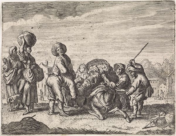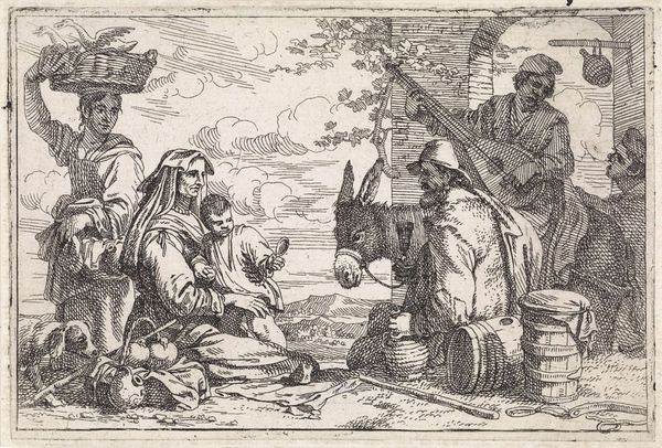 Gerrit de Heer made this etching, "Drinkers and Smokers in an Interior," sometime around the mid-17th century. It depicts a scene of revelry, but also provides a glimpse into the social lives of ordinary people during the Dutch Golden Age. The composition is rich with visual codes. A map hangs on the wall, possibly alluding to Dutch maritime power and trade. We can see tobacco use, a relatively new and increasingly common habit in Europe at the time. The figures themselves, with their exaggerated expressions, could be seen as a commentary on the social norms and behaviors of the lower classes. It's interesting to consider that this print may have been intended for a middle-class audience, offering them a window into a world both familiar and foreign. The historian, equipped with knowledge of Dutch society and the art market, can unpack the layers of meaning embedded in this seemingly simple scene. Archival documents, period literature, and other visual sources can further illuminate our understanding of its cultural context.
